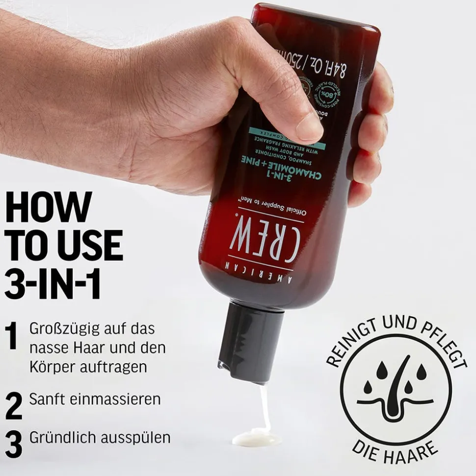 Das praktische American Crew Chamomile + Pine Relaxing 3-in-1 Shampoo mit entspannendem Duft von Kamille + Kiefer vereint drei Pflegeprodukte in einem und schenkt Deiner Männlichkeit die optimale Rundum-Pflege. Die leichte Formel des Pflegeshampoos verleiht dem Haar nicht nur ein angenehmes Tragegefühl, sondern reinigt sowohl den Körper, als auch die Haare und Kopfhaut sanft und effektiv. Das American Crew Chamomile + Pine Relaxing 3-in-1 Shampoo ist für jeden Haartyp geeignet und ideal für alle Männer, die Wert auf ein stilvolles Äußeres legen. Es pflegt Haar und Kopfhaut ohne zu beschweren und entfernt überschüssiges Fett sowie Unreinheiten, während es die Körperhaut remineralisiert und ihr Geschmeidigkeit verleiht. Zudem entwirrt es und sorgt für einen natürlichen Glanz gepflegter Männerhaare. Dank der 3 in 1 Eigenschaften ist das Produkt zudem der ideale Begleiter für unterwegs.