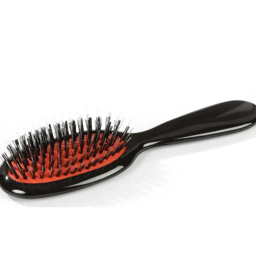 Die schwarze Braun & Wettberg Kunststoffbürste mit Naturborsten ist mit reinen Naturborsten und Nylonstiften ohne Noppen auf einem roten Kissen ausgestattet.