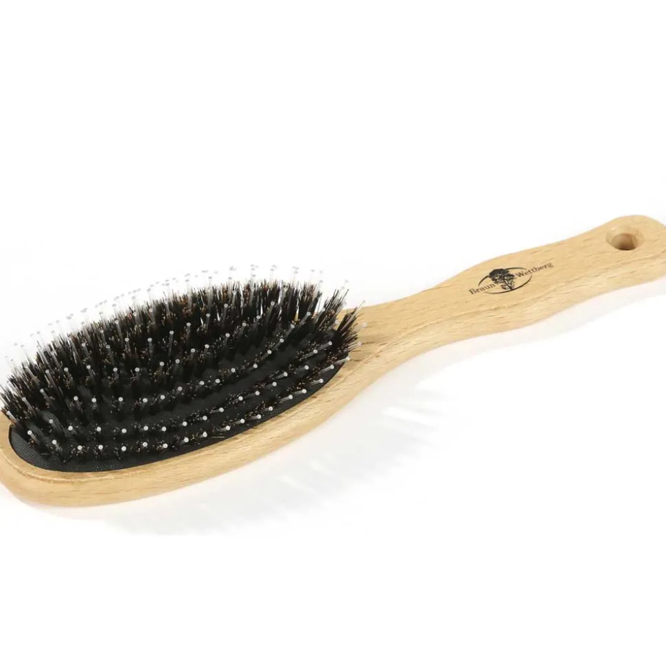 Die Braun & Wettberg Pflegebürste aus FSC-zertifiziertem Buchenholz verfügt über reine Naturborsten und Nylonstifte mit Kugelenden.