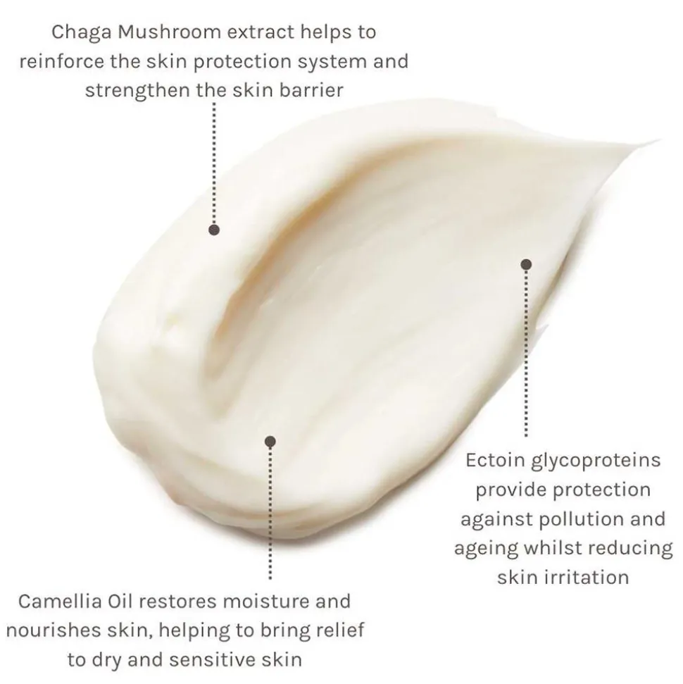 | Inhaltsstoffe | Aqua (Wasser), Pentylenglykol (aus Zuckerrohr), Coco-Caprylate, Caprate, Isoamyl Laurate, Cetearylalkohol, Glycerin, Natriumstearoylglutamat, Ectoin, Glycerylstearat, Jojobaester, Butyrospermum Parkii (Shea) Butter*, Camellia Oleifera-Samenöl*, Inonotus Obliquus (Pilz)-Extrakt, Aloe Barbadensis-Blattsaftpulver*, Natriumhyaluronat, mikrokristalline Cellulose, Xanthangummi, Cellulosegummi, Zitronensäure, Tocopherol, Natriumgluconat, Helianthus Annuus (Sonnenblumen) Samenwachs, Helianthus Annuus (Sonnenblumen) Samenöl, Polyglycerin-3. *Inhaltsstoffe aus biologischem Anbau |