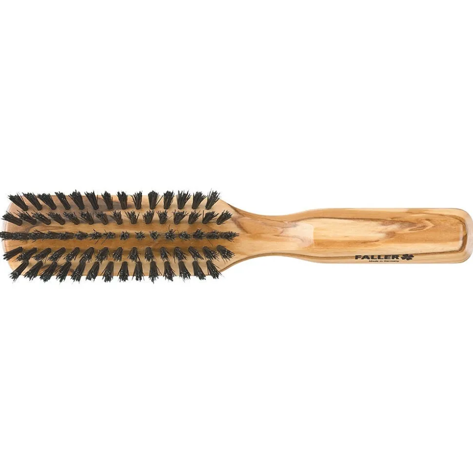 Die Faller Haarbürste Olivia flach Naturborste 5-reihig ist eine Pneumassagebürste aus Olivenholz mit reinen Wildschweinborsten.