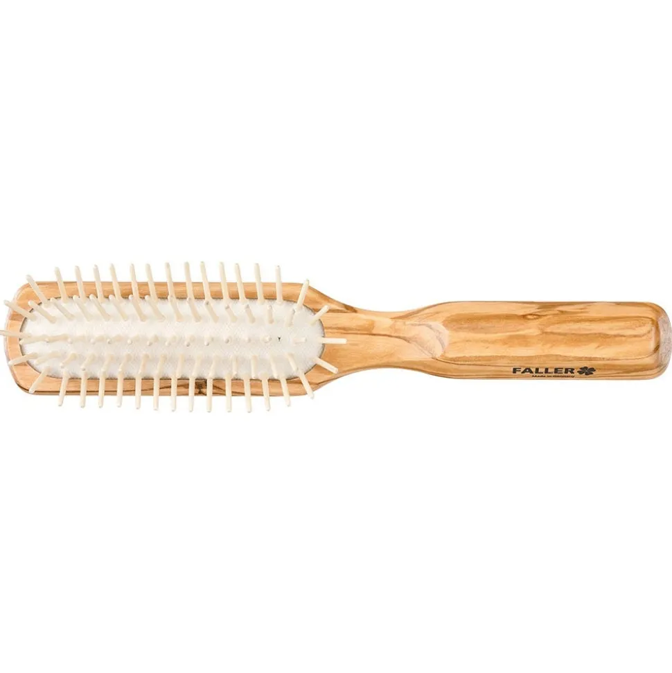 DIe Faller Haarbürste Olivia schmaler Griff mit Holzstiften ist eine Pneumassagebürste aus Olivenholz mit Holzstiften.
