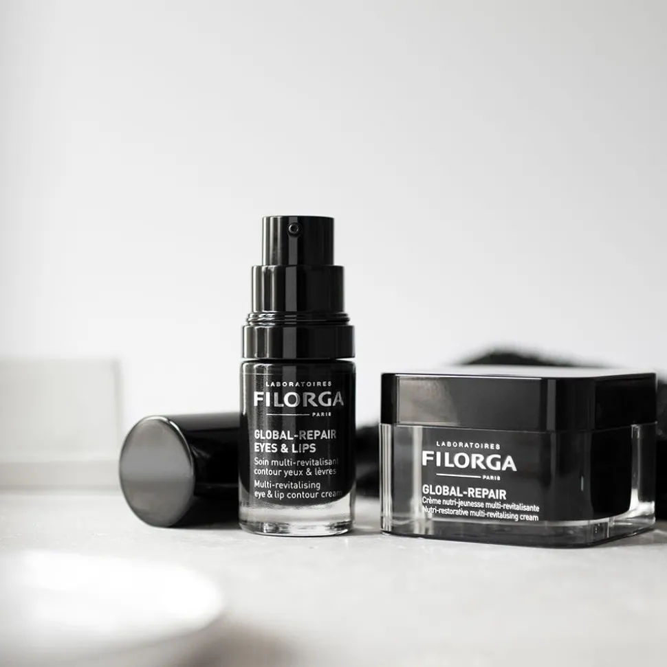 Das FILORGA Global Repair Eyes & Lips eine multi-aktive, konzentrierte Pflege speziell für devitalisierte Haut, die für einen sichtbaren und intensiven Anti-Ag ing-Effekt von anerkannten Schönheitstechniken inspiriert ist. Revitalisierende, nährende Pflege – drei hochwirksame Nährstoffe wirken synergetisch, um der Haut Geschmeidigkeit und Vitalität zurückzugeben. Multi-intensive Anti-Aging Korrektur – 50 Inhaltsstoffe aus der Mesotherapie + 4 Zell-Booster, die von Techniken der ästhetischen Medizin inspiriert wurden, werden kombiniert, um auf alle Zeichen der Hautalterung einzuwirken.GLOBAL-REPAIR EYES & LIPS enthält einen Tuberose-Extrakt, der die Mikrozirkulation auf die Augenkontur aktiviert für einen intensiv verjüngenden Effekt sowie einen glättenden Sesamkern-Extrakt, um die Lippenkontur neu zu zeichnen.