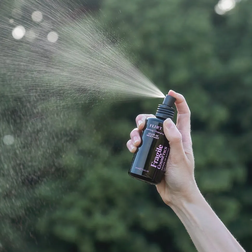 Das Fragile Flirt Leave-In Milky Mist ist ein Leave-In Detangler und Smoother mit Aloe Vera. Die Formel pflegt und entwirrt sofort – für geschmeidiges Haar ohne zu beschweren. Das Leave-in Spray wurde von Franco Gobbi entwickelt – der Hairstylist hinter den Looks von Stars wie Bella Hadid und Kendall Jenner. Das Leave-in-Mist sorgt für Glanz, Schutz und Anti-Frizz. Aloe Vera beruhigt und spendet Feuchtigkeit, Hydrolysierte Proteine stärken die Haarfaser und verhindern Haarbruch. Die Formel ist natürlich parfümiert mit Feige, Pfirsich, Bergamotte und Jujube.