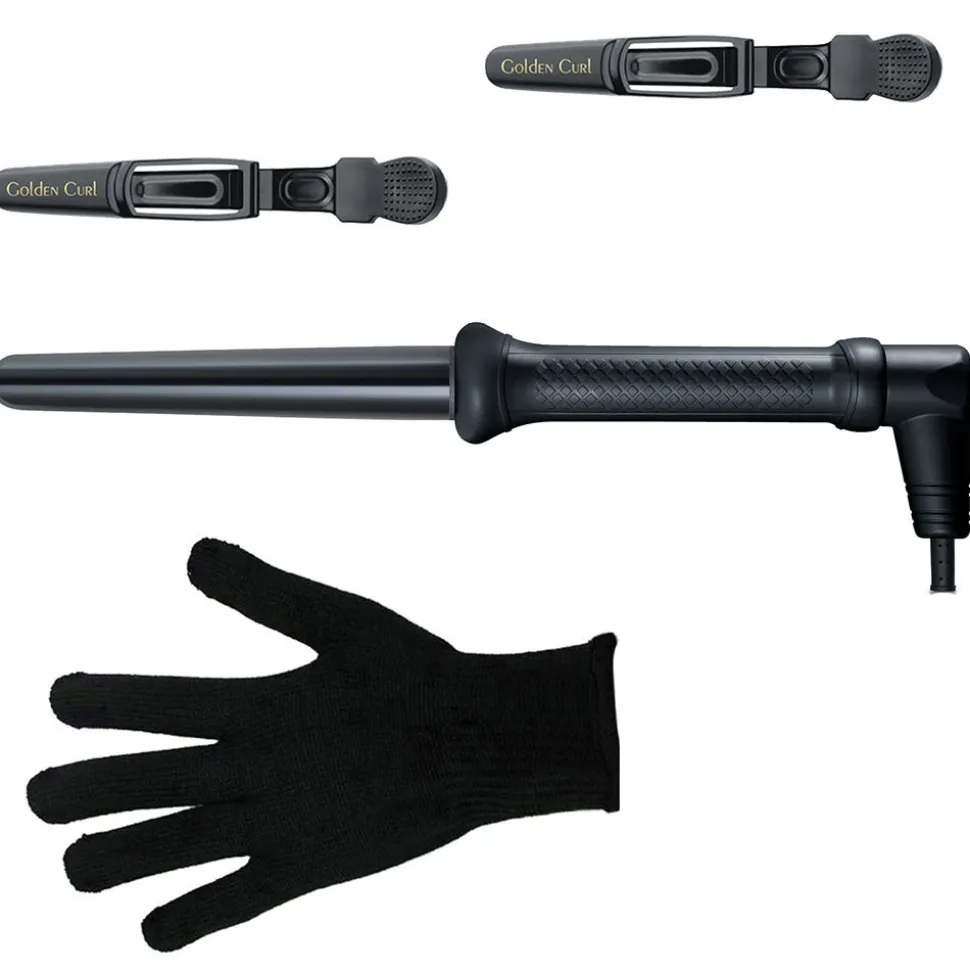 Der Golden Curl Lockenstab (Schwarz) ist ein Keramik Turmalin beschichteter Lockenstab mit 18 mm – 25 mm Durchmesser für mittlere bis große Locken und einen atemberaubenden Beach Waves Look wie vom Friseur. Haarschonendes Styling dank der fortgeschrittenen Inonen Technologie. Die Lockenstäbe heizen ultra schnell auf bis zu 200°C und kommen mit professionellem Zubehör für optimale Handhabung und ein einzigartiges Styling Erlebnis. Für bequeme Handhabung für Heimanwender und Haarytlisten. Der Lockenstab kommt mit einem Hitzehandschuh und Kroko Clips Abteilklammern.