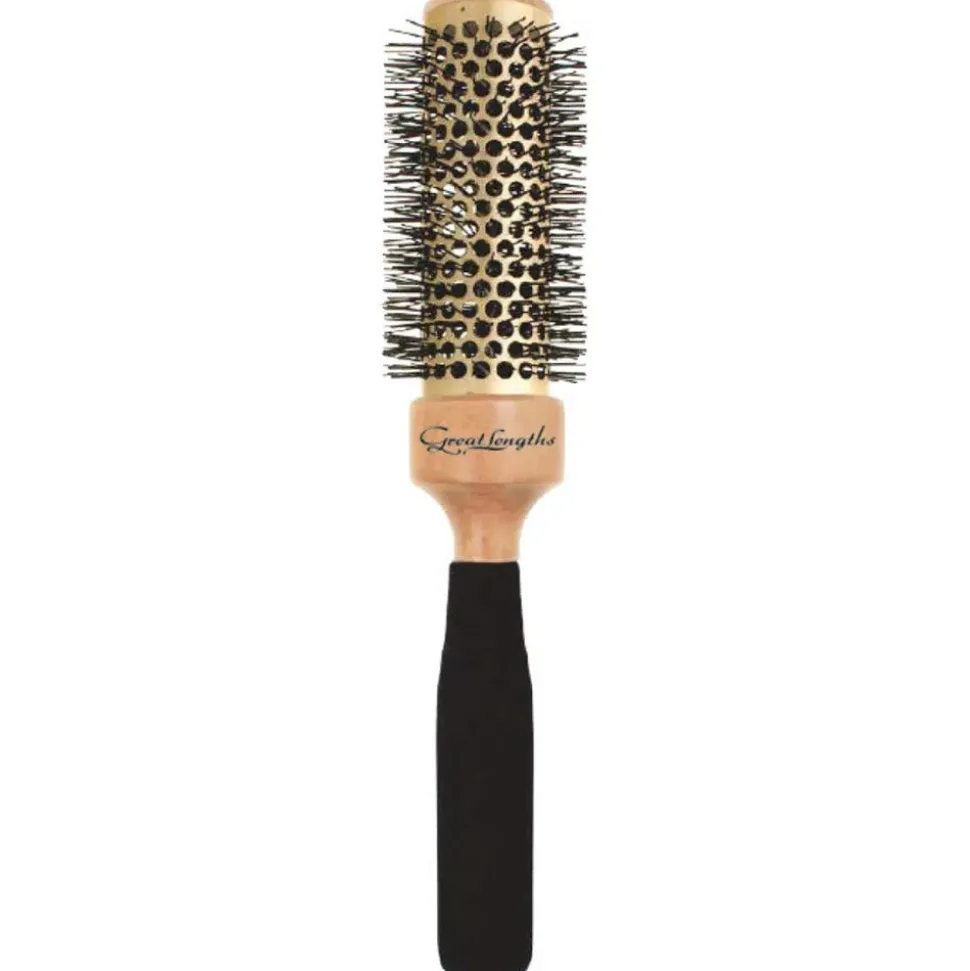 Die Great Lenghts Retro Rundbürste für das Red-Carpet-Feeling. Extra konzipiert für das Styling langer Haare, zaubert die Rundbürste schwungvolle Hollywood-Wellen, perfekt liegende Ponys oder einfach mehr Volumen. Das Design reiht sich mit seinem Schaumstoff-Griff und seinem Holzfarbton wunderbar in die Retro-Serie von Great Lenghts ein. Dank des wärmespeichernenden, goldfarbenen, keramikbeschichteten Hohlkörper trockenen die Haare schneller und die Föhnzeit verkürzt sich.