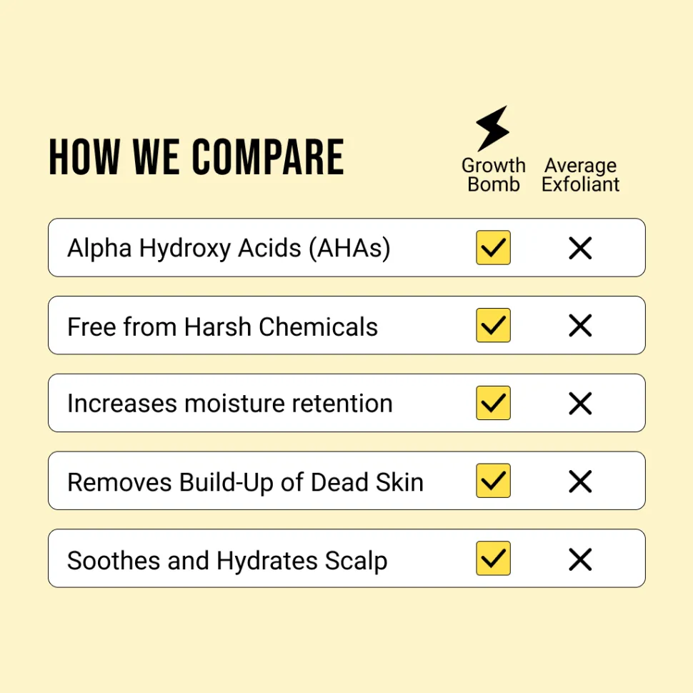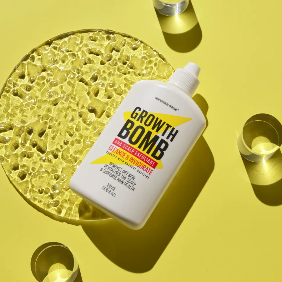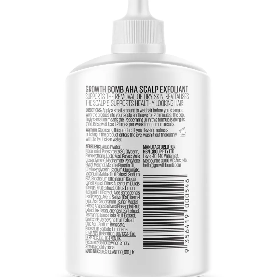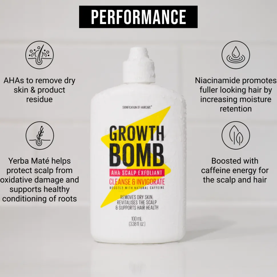 Das Growth Bomb Haar Kopfhaut AHA-Peeling ist ideal zur Entfernung trockener Haut, zur Revitalisierung der Kopfhaut und zur Unterstützung der Haargesundheit. Dieses kraftvolle Kopfhaut-Peeling ist mit natürlichem Koffein aus Yerba-Maté-Blättern angereichert, das reich an Antioxidantien ist und eine gesunde Kopfhaut sowie gesundes Haar erhält. Die AHA-Peeling-Formel reinigt die Kopfhaut von trockener, abgestorbener Haut und Styling-Rückständen. Angereichert mit einheimischen Pflanzenextrakten und AHAs aus Fruchtextrakten, peelt sie sanft, reinigt, hydratisiert und belebt. Eine silikonfreie Tiefenreinigung, die die Kopfhaut revitalisiert und das Haar stärkt.