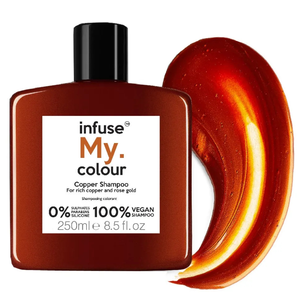 Das Infuse My. Colour Copper Shampoo verleiht dem Haar einen leuchtenden Kupfer Schimmer. Besonders effektiv auf braunem Haar, für einen waremen Unterton. Orange-violetter Unterton.