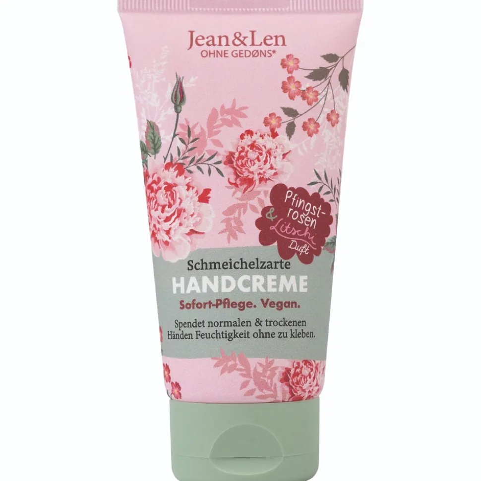 Die Jean & Len Handcreme Pfingstrose & Litschi verwöhnt deine Hände mit einem fruchtig-blumigen Duft und pflegenden Inhaltsstoffen, für spürbar zarte Haut.