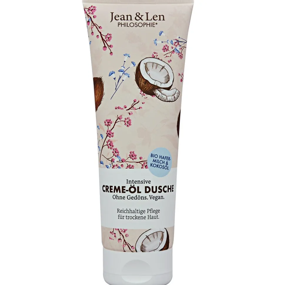 Die intensive Jean & Len Philosophie Creme Öl Dusche mit einem Pflegekomplex aus Kokosöl, Bio Hafermilch und Glycerin verwöhnt trockene Haut mit ihrem reichhaltigen und zarten Schaum und hilft sie vor dem Austrocknen zu schützen. Für spürbar weichere und geschmeidigere Haut. Des weiteren ist die Duschcreme ohne Parabene und Silikone.