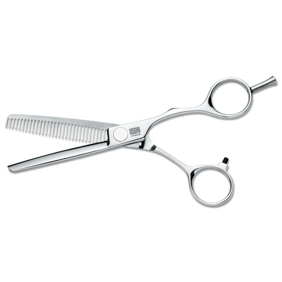 Das Kasho Chrome Individual Set besteht aus der Kasho Chrome in 6,0“ offset mit flacher, stufenbar einstellbarer Schraube und fester Fingerauflage, aus der Kasho Design Master Texturizer Modellierschere in 6,0“ mit 30 Zähnen oben und flacher Schraube, sowie abschraubbarer Fingerauflage, Kasho Carbonkämme C809 und C817 in Kasho Etui K-21.