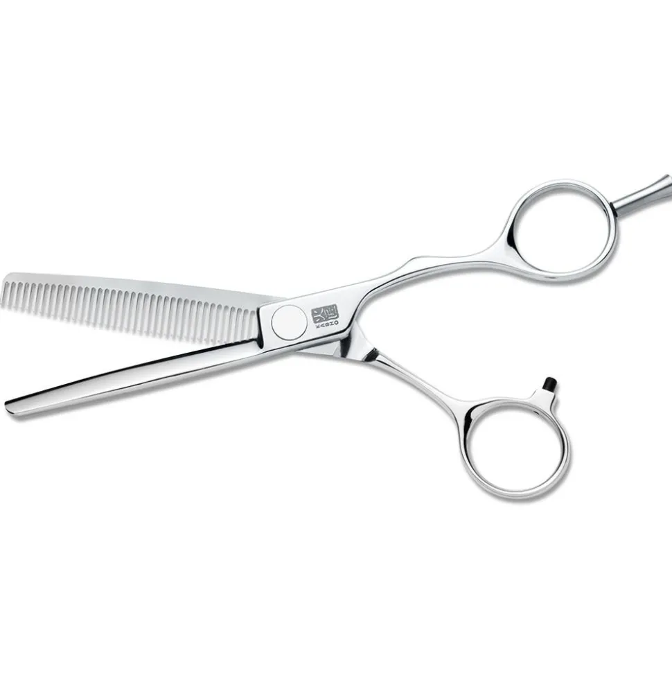 Das Kasho Chrome Individual Set besteht aus der Kasho Chrome in 5,5“ offset mit flacher, stufenbar einstellbarer Schraube und fester Fingerauflage, aus der Kasho Design Master Texturizer Modellierschere in 6,0“ mit 38 Zähnen oben und flacher Schraube, sowie abschraubbarer Fingerauflage, Kasho Carbonkämme C809 und C817 in Kasho Etui K-21.