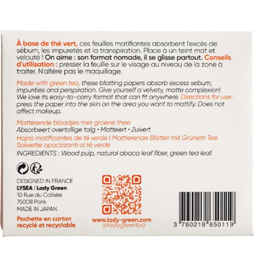 LADY green Tea Oil Blottimg Papers ist aus grünem Tee hergestellt und absorbiert überschüssigen Talg. Unreinheiten und Schweiß werden abgetragen. Grüner Tee wird Ihre Haut reinigen, beruhigen und erfrischen. 100% der Gesamtzutaten sind natürlichen Ursprung
