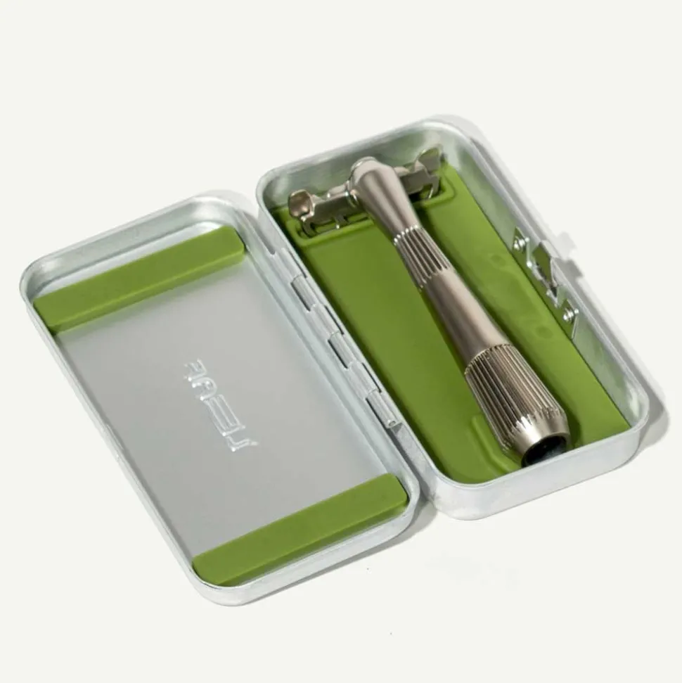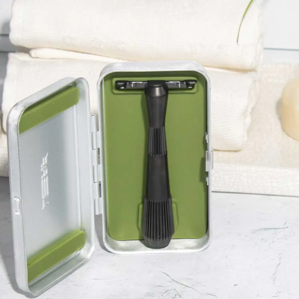 Das Leaf Shave Twig Travel Case Silver ist ein praktisches und robustes Etui für den Twig Rasierer, um ihn auf Reisen geschützt aufzubewahren. Hergestellt aus leichtem Aluminium, zuverlässigen Klappenscharnieren mit Druckknopfverschluss und schützenden Silikoneinlagen, ist dieses Hartschalenetui der perfekte Begleiter für die plastikfreie Rasur unterwegs. Leaf Shave kompensiert ihren gesamten CO2-Fußabdruck – von den Rohstoffen, über die Produktion, bis hin zum Versand, ist Leaf Shave zertifiziert klimaneutral.