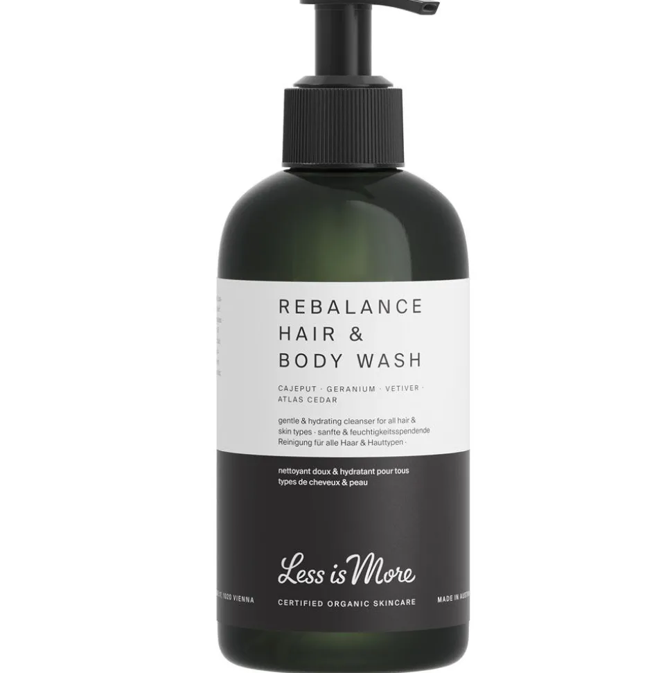 Das LESS IS MORE Rebalance Hair & Body Wash bietet eine sanfte, pflanzenbasierte Reinigung für Haut und Haar. Die milde Formulierung bewahrt die Feuchtigkeit, verleiht dem Haar gesunden Glanz und hinterlässt die Haut erfrischt und geschmeidig. Aloe Vera spendet intensive Feuchtigkeit, natürliche Fermente wirken beruhigend und Lipidkomponenten fördern die Regeneration der Haut. Für alle Haut- und Haartypen geeignet – auch für empfindliche Haut und Kinder.