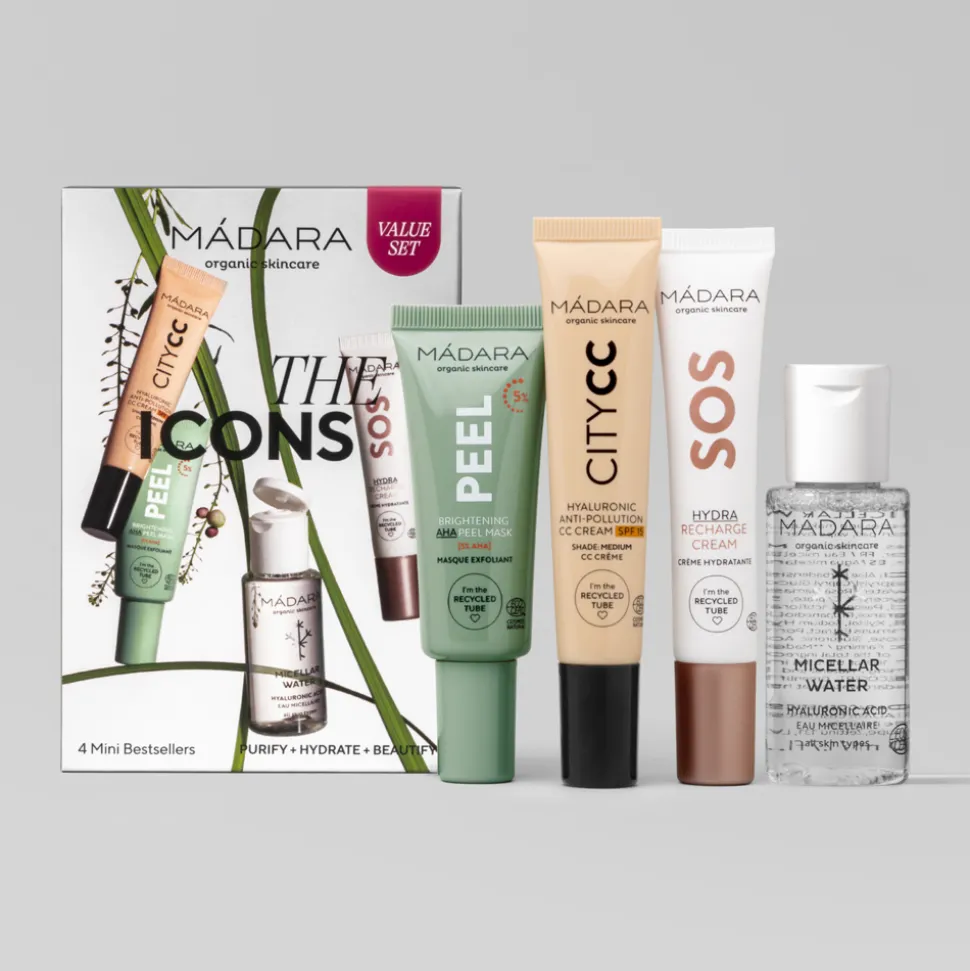 Das MÁDARA The Icons Set Medium enthält vier MÁDARA Basis-Hautpflegeprodukte in Testgröße, mit denen du deine Haut mit Inhaltsstoffen aus der nordischen Natur pflegen kannst. Perfekt zum Ausprobieren und auf Reisen. Dieses 4-in-1-Set bietet dir einen Mehrwert für deine Pflege.