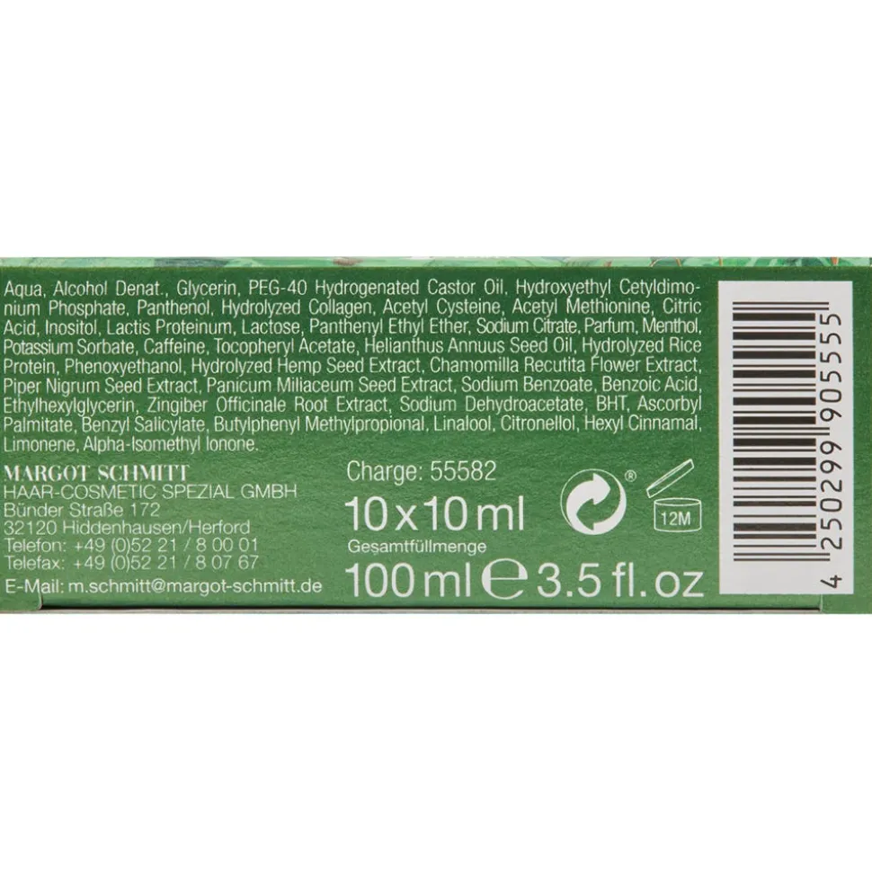 | Inhaltsstoffe | Aqua, Alcohol Denat., Glycerin, PEG-40 Hydrogenated Castor Oil, Hydroxyethyl Cetyldimonium Phosphate, Panthenol, Hydrolyzed Collagen, Acetyl Cysteine, Acetyl Methionine, Citric Acid, Inositol, Lactis Proteinum, Lactose, Panthenyl Ethyl Ether, Sodium Citrate, Parfum, Menthol, Potassium Sorbate, Caffeine, Tocopheryl Acetate, Helianthus Annuus Seed Oil, Hydrolyzed Rice Protein, Phenoxyethanol, Hydrolyzed Hemp Seed Extract, Chamomilla Recutita Flower Extract, Piper Nigrum Seed Extract, Panicum Miliaceum Seed Extract, Sodium Benzoate, Benzoic Acid, Ethylhexylglycerin, Zingiber Officinale Root Extract, Sodium Dehydroacetate, BHT, Ascorbyl Palmitate, Benzyl Salicylate, Butylphenyl Methylpropional, Linalool, Citronellol, Hexyl Cinnamal, Limonene, Alpha-Isomethyl Ionone |