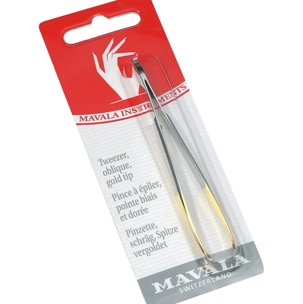 Die Mavala Pinzette schräg aus gehärtetem, warm geschmiedetem Stahl mit vergoldeter Spitze.