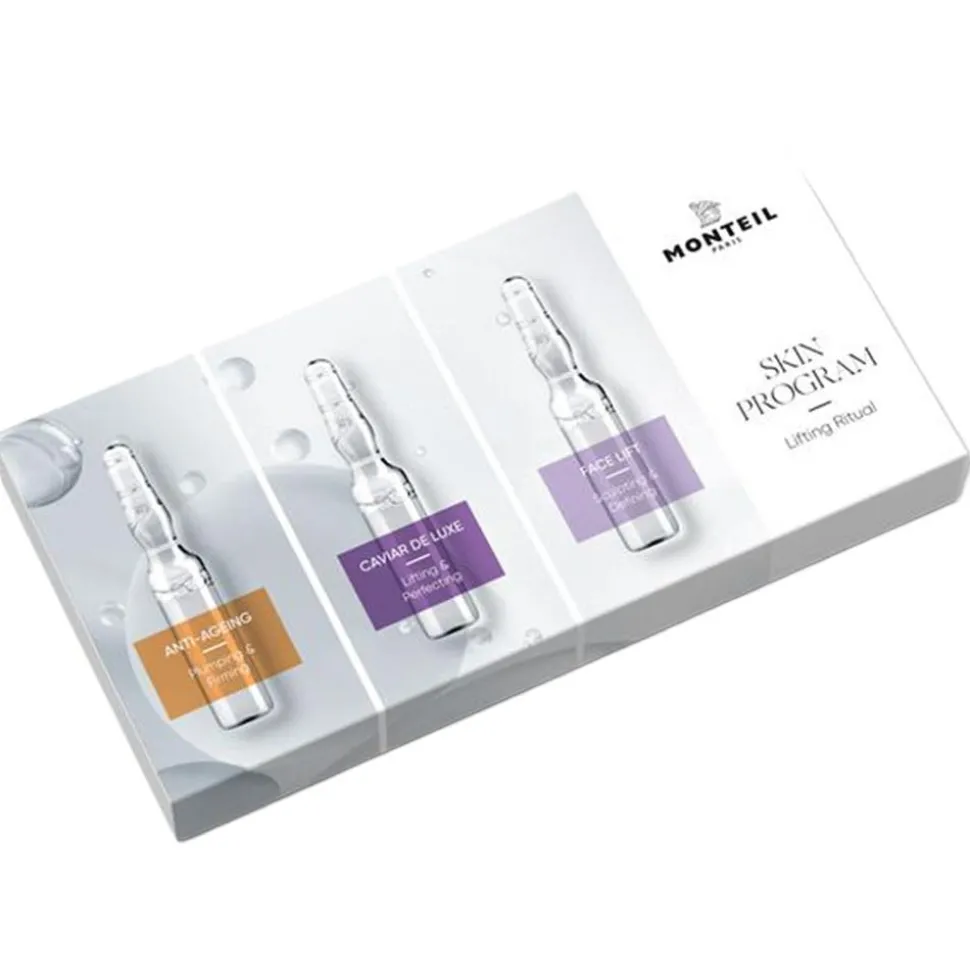 Eine straffende Monteil Paris Skin Program – Lifting Ritual Ampullen-Kur für fahle und erschlaffte Haut. Hochwertige Anti-Aging-Komplexe, festigende Lifting-Wirkstoffe und luxuriöser Caviar-Extrakt verbessern die Hautstruktur, sorgen für sichtbar straffere Konturen und ein definiertes Hautbild. Ideal bei nachlassender Spannkraft, ersten Fältchen oder einem fahlen Teint.
