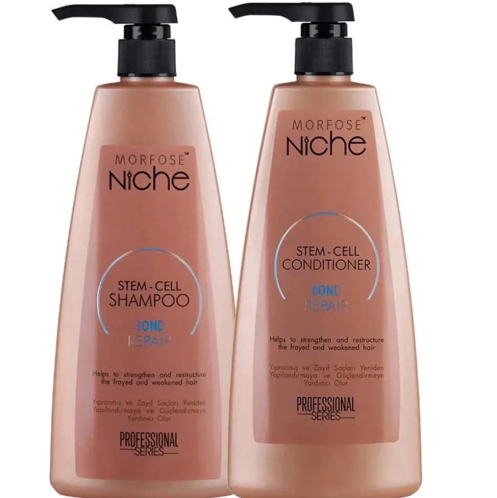 Das Morfose Niche Professionell Bond Repair Bundle vitalisiert das Haar mit Stammzellentechnologie. Inhalt: Morfose Niche Professionell Bond Repair Conditioner 1000 ml und Morfose Niche Professionell Bond Repair Shampoo 1000 ml.
