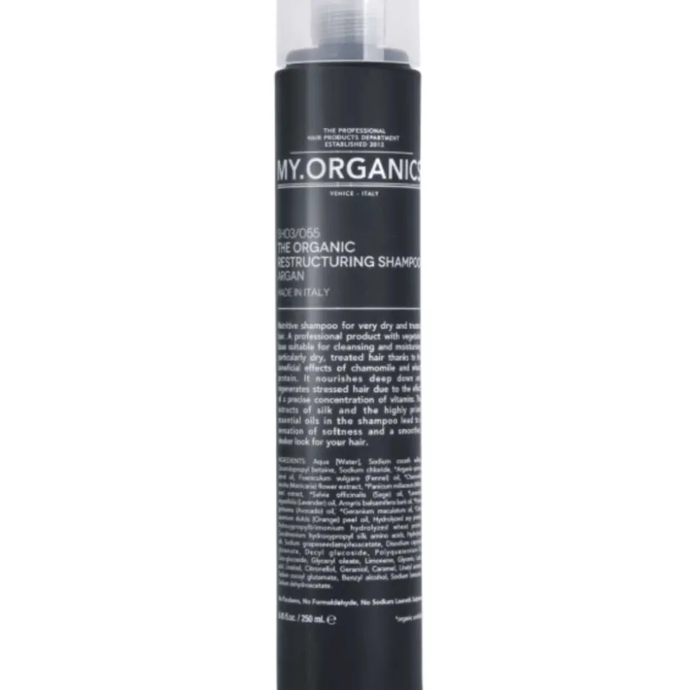 Das My.Organics My Restructuring Shampoo mit pH 5.0-5.5 ist ein nährendes professionelles Argan-Shampoo auf pflanzlicher Basis, feuchtigkeitsspendende Reinigung für besonders trockenes behandeltes Haar, durch die wohltuende Wirkung von Kamille und Weizenproteinen. Sorgfältig ausgesuchte Vitaminkonzentrate nähren und regenerieren strapaziertes Haar mit Tiefenwirkung. Seidenextrakte und wertvolle ätherische Öle verleihen Ihrem Haar ein weiches, glatteres und samtiges Aussehen.