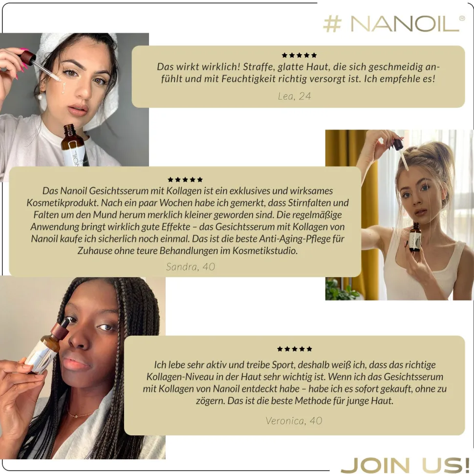 Das Nanoil Collagen Face Serum ist ein Anti-Aging-Serum mit Kollagen für müde, schlaffe Haut mit Falten. Kollagen ist ein wichtiger Bestandteil des Gewebes, deshalb lohnt es sich, es der Haut nach dem 30. Lebensjahr zu liefern, um den Alterungsprozess zu verlangsamen und der Haut mehr Elastizität zu verleihen. Das Nanoil Gesichtsserum mit Kollagen unterstützt den Kampf gegen Falten, versorgt die Haut mit Feuchtigkeit und verbessert die Elastizität der schlaffen Haut.