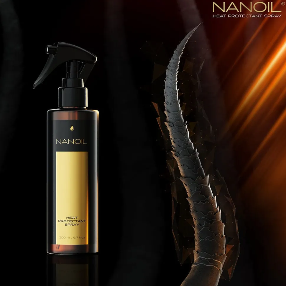 Das Nanoil Heat Protectant Spray ist ein Hitzeschutzpray, das die Haare vor hohen Temperaturen bis 220 Grad Celsius schützt. Seine leichte Formel umhüllt jedes Haar mit einer schonenden Schicht, die sie vor Schäden durch die Hitze schützt, das Haarstyling erleichtert und die Kämmbarkeit verbessert. Das Nanoil Hitzeschutzspray enthält zusätzlich pflegende Seidenproteine, die krause, matte und widerspenstige Haare glätten und glanzvoll machen.