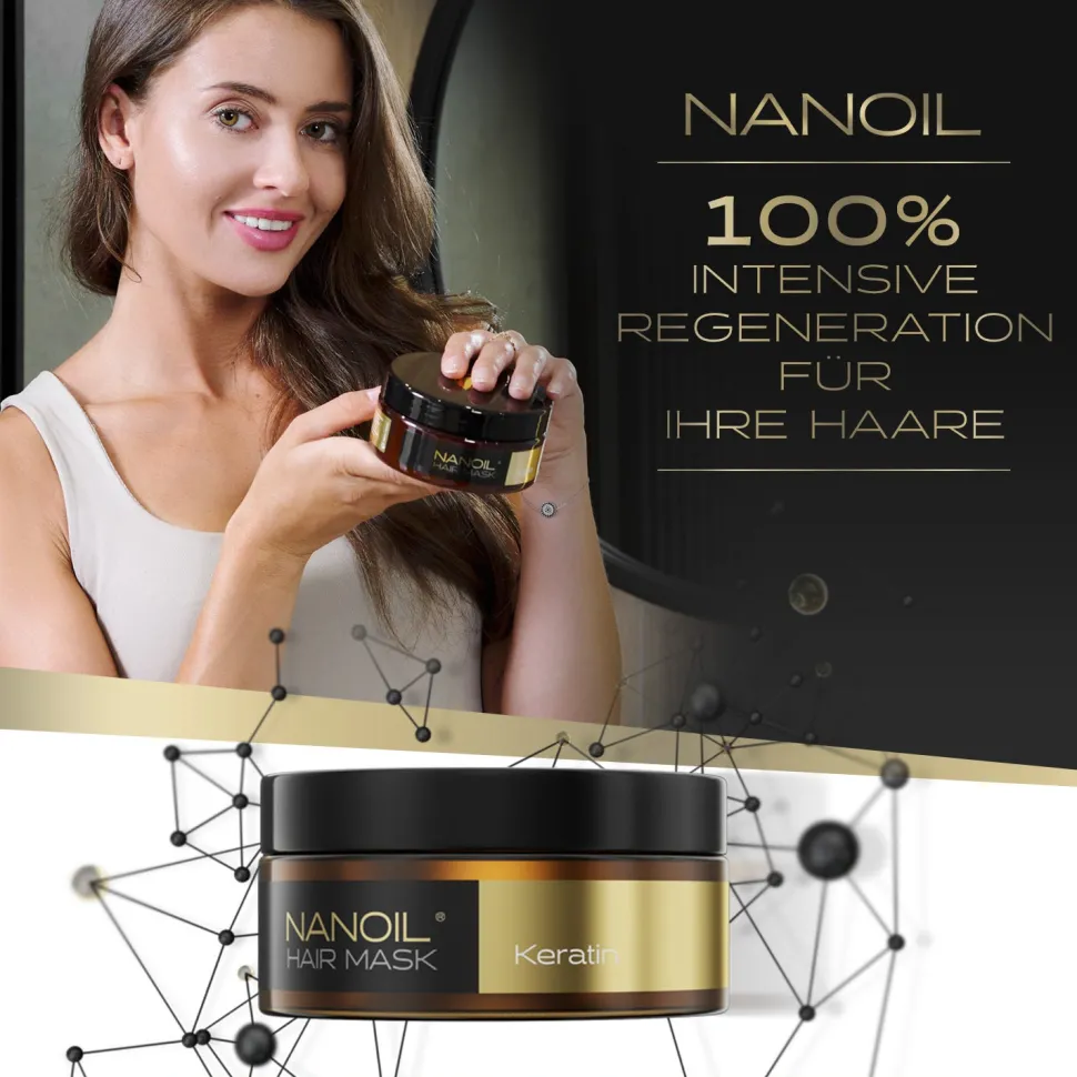 Die Nanoil Keratin Hair Mask ist eine regenerierende Haarmaske mit Keratin für jeden Haartyp – auch für trockene, geschädigte, geschwächte Haare, die eine spezielle Pflege erfordern. Sie verleiht den Glanz sogar sehr geschwächten und geschädigten Haaren, stärkt sie und betont ihre Schönheit. Die Haarmaske mit Keratin sichert schnelle Effekte innerhalb kurzer Zeit, was bewirkt, dass der Zustand der Haare sich verbessert und die Haare schön wie nie zuvor sind.