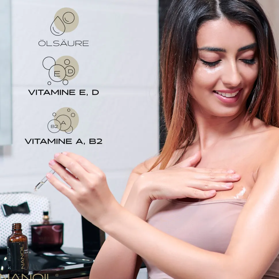- Massieren Sie das Nanoil Mandelöl in die Nagelplatte und Haarspitzen ein und verwenden Sie es zur Pflege der Haut um die Augen herum.