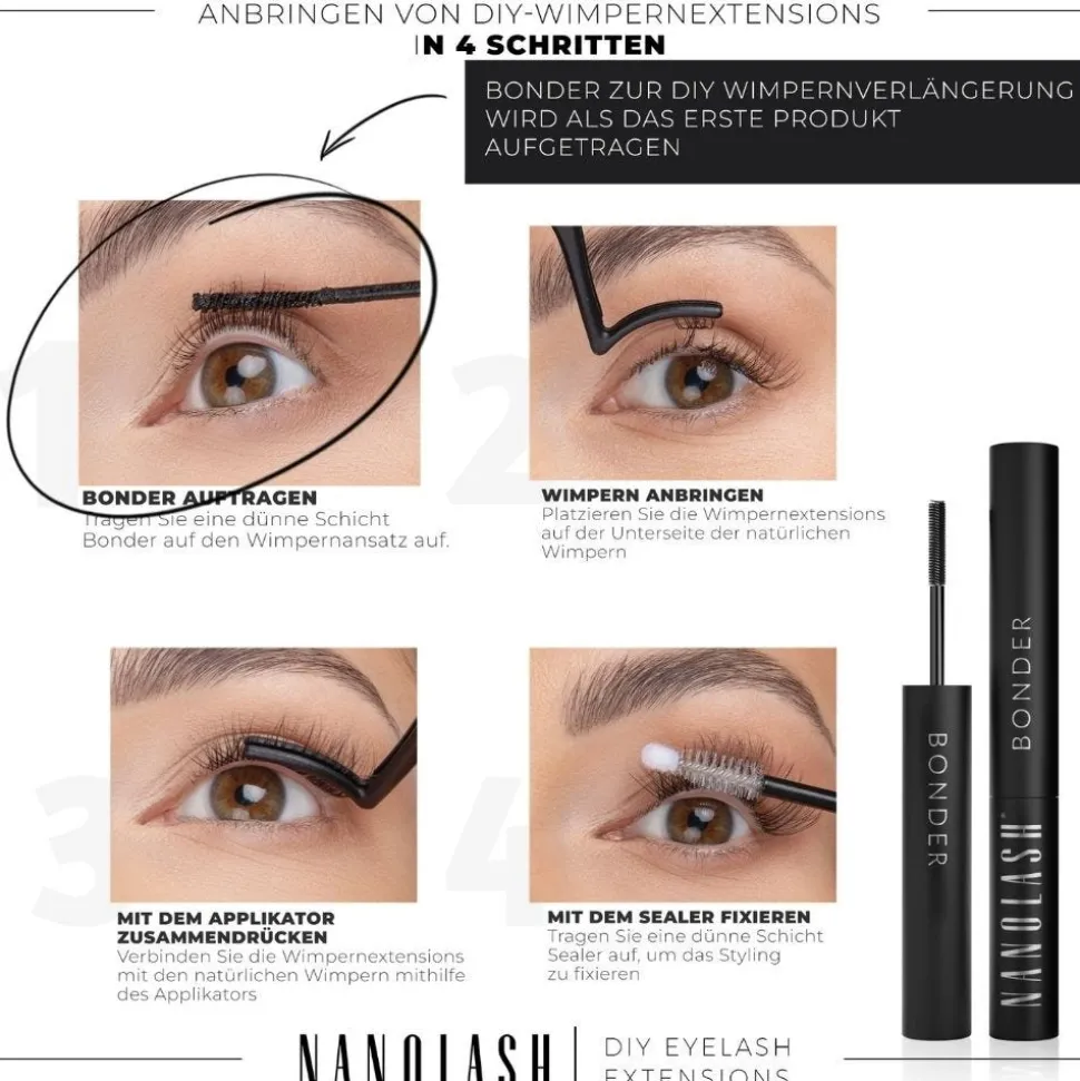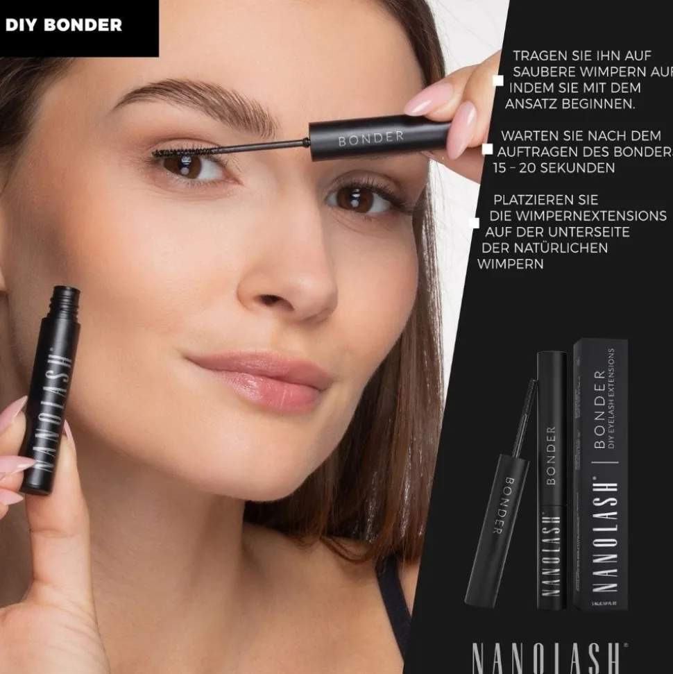 Nanolash DIY Bonder ist ein revolutionärer Kleber zur Wimpernverlängerung zu Hause. Das Produkt wurde mit einem ergonomischen Pinsel ausgestattet, mit dem du ihn ohne Probleme auf die Härchen auftragen – genauso wie eine Wimperntusche. Seine einzigartige Formel bewirkt, dass die Kunstwimpern mindestens 5 Tage lang an Ort und Stelle bleiben und in dieser Zeit perfekt aussehen. Der nächste große Vorteil des Produkts ist seine hohe Unempfindlichkeit gegen Wasser und Abschminkprodukte mit Ölen im Inhalt.