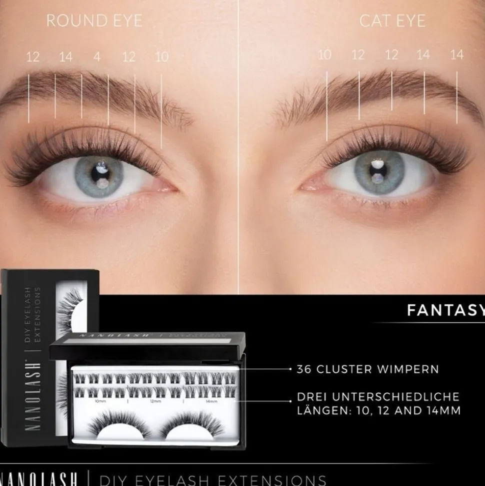 Dank der Nanolash FANTASY Wimpern kannst du die teure Wimpernverlängerung in einem Kosmetikstudio vergessen. Binnen ledilich 10 Minuten kannst du einen genauso beeindruckenden Effekt zu Hause erzielen. Wenn du dich für ein komplettes Set mit Cluster Wimpern entscheidest, bekommst du alles Notwendige und kannst sofort die Wimpernverlänerung selber machen. Im ästhetischen Kästchen findest du 36 Wimpernsemente in verschiedenen Längen. Diesbezülich erfüllen die Nanolash FANTASY Wimpern die Erwartungen aller Frauen – sowohl der Anhängerinnen einer spektakulären Wimpernverlänerung als auch der Fans der natürlichen Effekte. Die Wimpernextensions wurden um Bonder und Sealer bereichert, die das einfache Anbringen ermöglichen. Im Set findest du ebenfalls einen präzisen Applikator, der dazu beiträt, dass die selbstständige Wimpernverlänerung eine einfache und angenehme Tätigkeit ist. Das Wimpernverlänerung-Set enthält überdies Remover zur Entfernung der Wimpernextensions. Die Cluster Wimpern ermöglichen 4–6 einzelne Wimpernverlänerungen – in Abhängikeit von der Augengröße. Die Einzelbehandlug garantiert einen schönen Blick bis zu 7 Tagen lang.