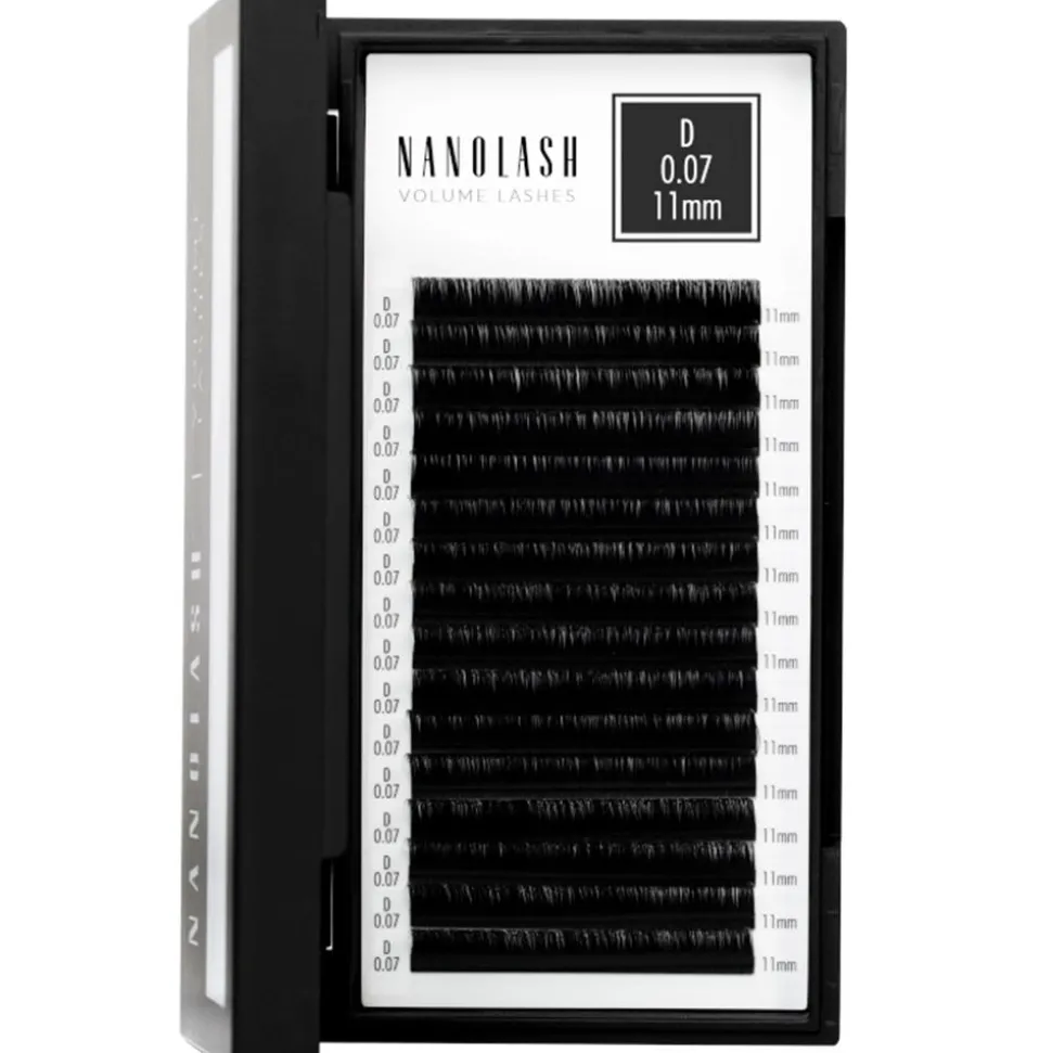 Die Nanolash Volume Lashes 0.07 D 11mm zur Wimpernverlängerung im Stil „Silk Lashes“ sind zur Anwendung in Kosmetikstudios bestimmt. Sie wurden aus einem hochwertigen, synthetischen Stoff hergestellt, wodurch sie Erwartungen der besonders anspruchsvollen Kundinnen und Wimpernstylistinnen erfüllen. Sie zeichnen sich durch eine überdurchschnittliche Qualität aus, weil sie dicht gewebt und handgemacht sind. Die künstlichen Wimpern sind nicht nur besonders weich und elastisch, sondern auch den menschlichen Naturwimpern täuschend ähnlich. Sie ermöglichen beeindruckende Effekte dank der haltbaren Biegung, tiefen Farbe und großen Auswahl der Wimpernvarianten. Die Wimpernextensions kommen in fünf Dicken und acht Längen vor. Zur Auswahl stehen außerdem zwei Biegungstypen. Diesbezülich ist es möglich, die Kunstwimpern an die individuellen Bedürfnisse problemlos anzupassen. Die Wimpernextensions Nanolash Volume Lashes bewähren sich sowohl bei Volumentechniken als auch bei der klassischen Wimpernverlängerung. Die Struktur der Härchen ermöglicht die Bildung der Wimpernbüschel mit der Shifting- oder Scratch-Methode.