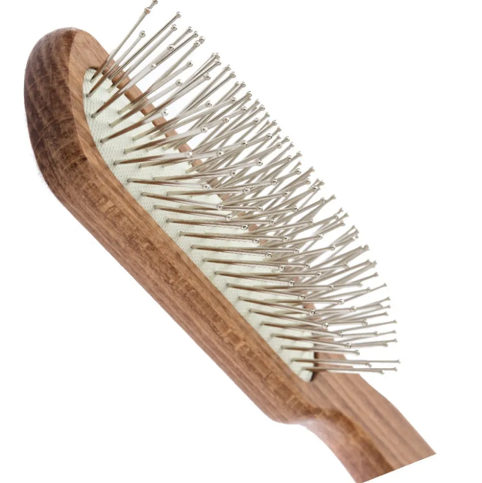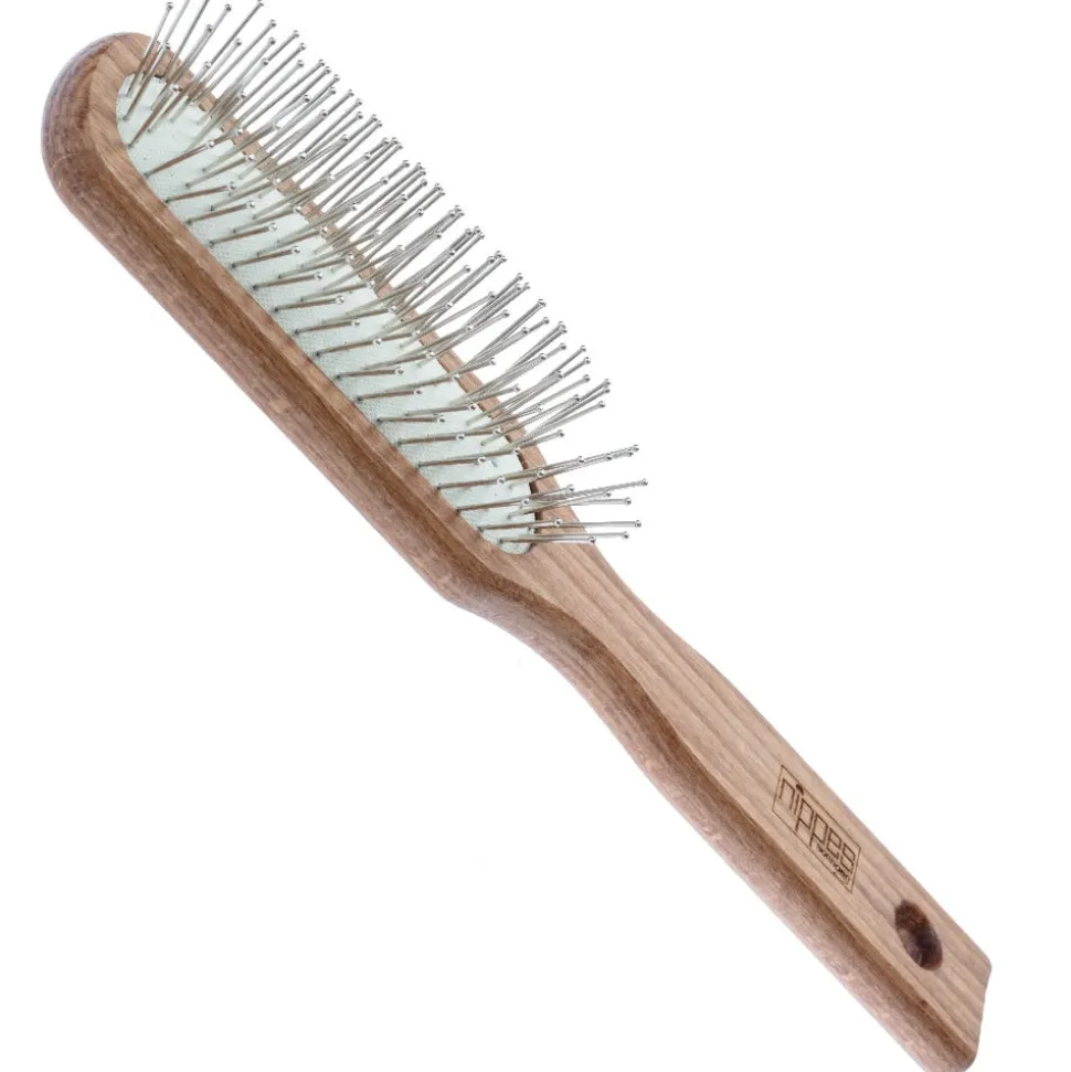 Die Nippes H7 Pneumatic-Haarbürste ist länglich geformt und entwirrt das Haar schnell und schonend. Die Luftpolsterung des Gummikissens ist dabei besonders schonend zur Kopfhaut. Die Haarbrüste ist mit Stahlstiften mit Kugelkopf versehen, um ein angenehmes Styling zu ermöglichen. Die Kugelköpfe sorgen für eine sanfte Kopfmassage und entwirren sowohl trockenes als auch nasses Haar problemlos. Auch ideal zum Stylen.