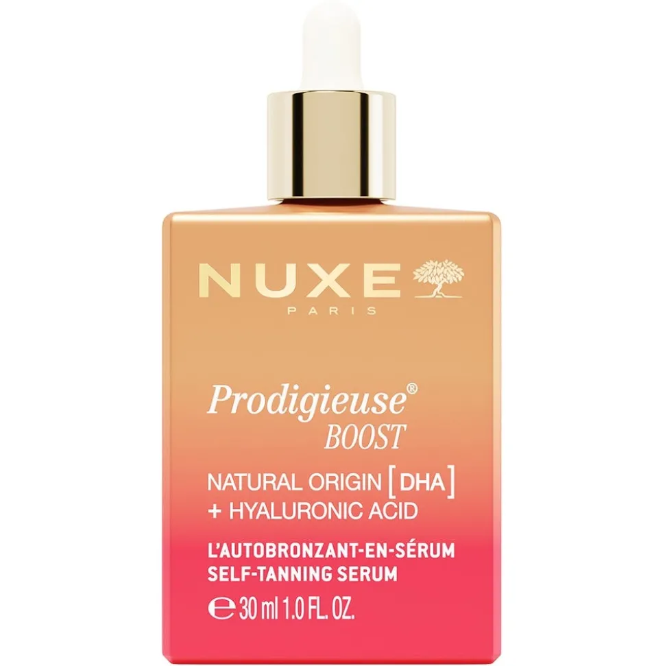 Das NUXE Prodigieuse Boost Selbstbräunungsserum verleiht der Haut eine natürliche Bräune und schützt sie mit stabilisiertem Vitamin C vor freien Radikalen. Die vegane Formel mit 99 % Inhaltsstoffen natürlichen Ursprungs sorgt für eine strahlende Haut und verfeinert das Hautbild. Das Serum hat eine angenehme, ultra-leichte Textur und einen subtilen Duft. Dieses Serum kombiniert die Vorteile einer Pflege mit den Effekten eines Selbstbräuners. Dank der innovativen Formel, die mit feuchtigkeitsspendender Hyaluronsäure angereichert ist, wird die Haut intensiv gepflegt, aufgepolstert und langanhaltend mit Feuchtigkeit versorgt. Mit 100 % natürlicher DHA umhüllt das Serum die Haut mit einer gleichmäßigen, natürlichen und progressiven Bräune – als käme man direkt aus dem Urlaub! Die leichte Textur zieht schnell ein, macht die Haut geschmeidig und sorgt für ein angenehmes Hautgefühl. Statt des typischen DHA-Dufts, begeistert das Serum mit einem frischen, prickelnden Duft von Jasmin und rosa Litschi. Es hinterlässt keine Flecken. In Frankreich entwickelt und hergestellt.