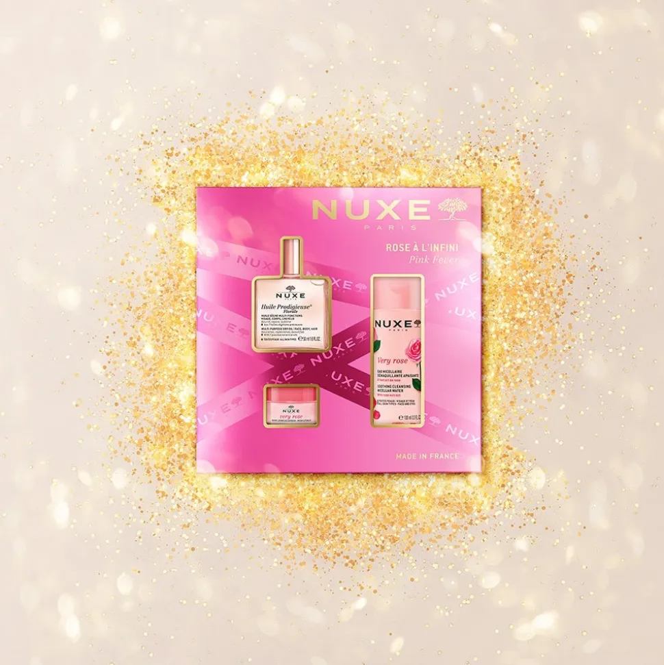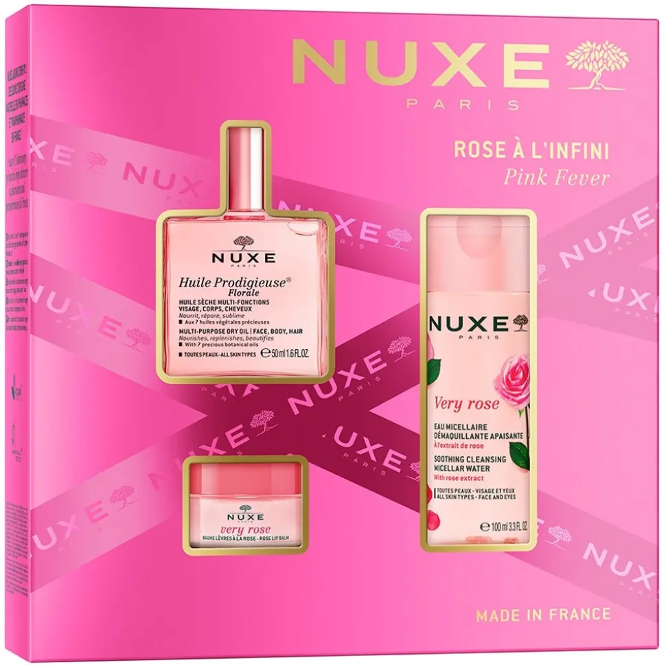 NUXE Prodigieuse Florale Bestseller Geschenkset – Drei verwöhnende Hautpflegeprodukte, die mit einem intensiv sinnlichen Cocktail aus belebenden floralen Noten Deine Sinne erfrischen. Das Set enthält 1x NUXE Huile Prodigieuse Florale Körperöl 50 ml, 1x NUXE Very Rose Mizellenwasser 100 ml und 1x NUXE Very Rose Lippenbalsam 15 g.
