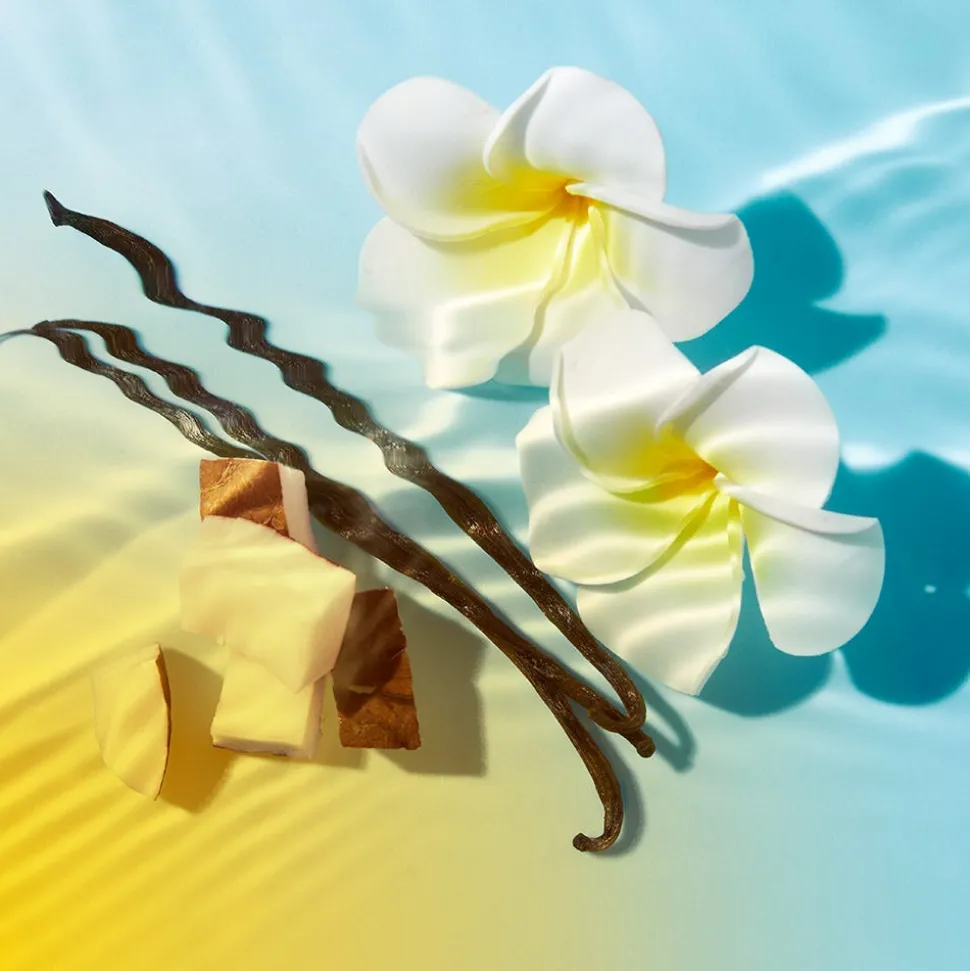Die Haut wird in einen Urlaubsduft gehüllt, basierend auf Noten von Süßorange, Tiaré-Blüten und Vanille.