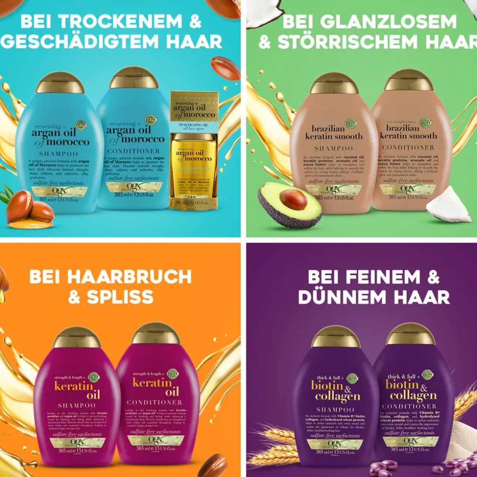 Die einzigartige Formel des OGX Renewing Argan Oil of Marocco Penetrating Oil mit wertvollem marokkanischem Arganöl stärkt, pflegt und kräftigt das Haar. Es verbessert die Haarstruktur und verleiht ein unglaublich weiches und geschmeidiges Haargefühl. Das Haar erhält einen hinreißenden Glanz und wird wirksam vor Schädigungen durch Hitze-Styling geschützt.