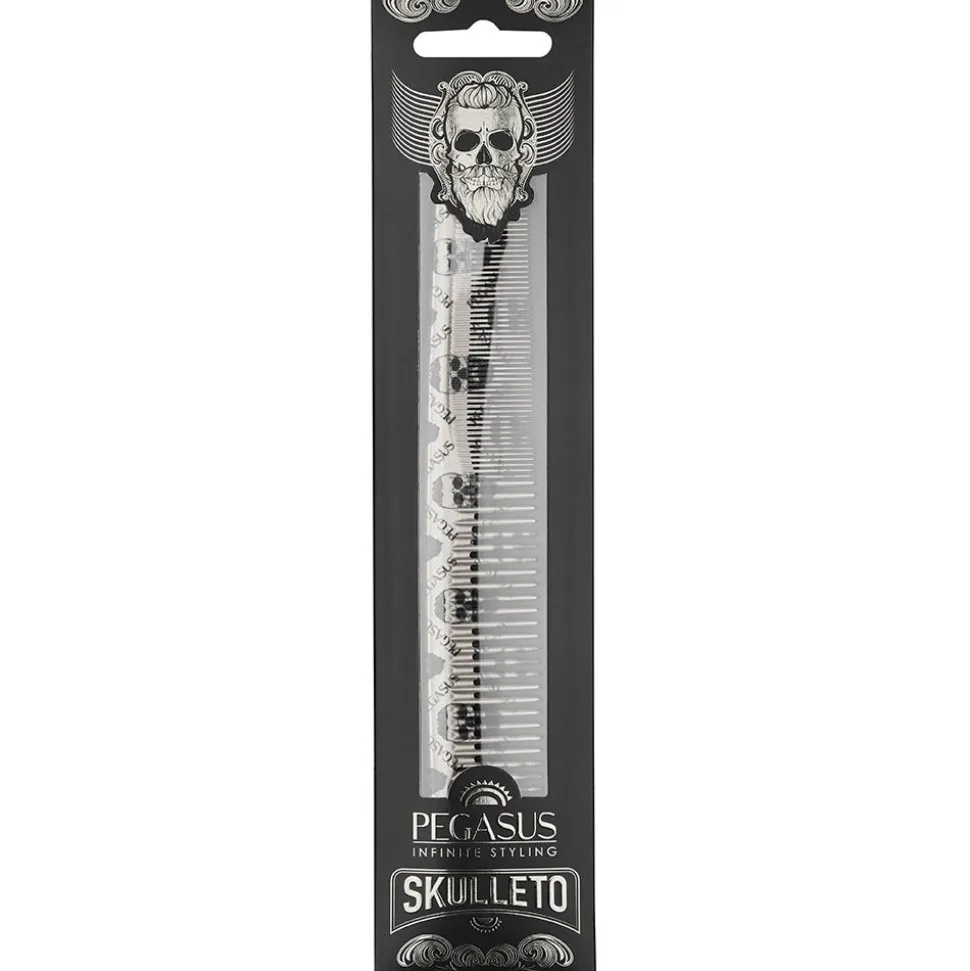 Pegasus Skulleto 201 silber Haarschneidekamm mit dem charakteristischen Totenkopf-Print. Dieser stylische Kamm wurde handgearbeitet und ist dadurch gratfrei mit perfekt abgerundeten Zähnen, die Haare und Kopfhaut schonen. Das aus Naturkautschuk hergestellte Ebonit gibt dem Haarschneidekamm die perfekten Eigenschaften: Elastisch, leicht und stabil, höchst hitze- und chemikalienbeständig sowie robust und langlebig.