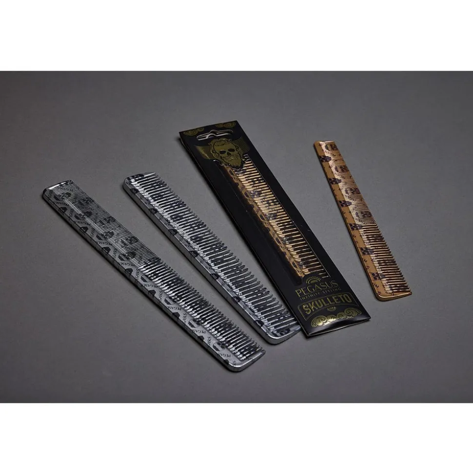 Pegasus Skulleto 202 gold Haarschneidekamm mit dem charakteristischen Totenkopf-Print. Dieser stylische Kamm wurde handgearbeitet und ist dadurch gratfrei mit perfekt abgerundeten Zähnen, die Haare und Kopfhaut schonen. Das aus Naturkautschuk hergestellte Ebonit gibt dem Haarschneidekamm die perfekten Eigenschaften: Elastisch, leicht und stabil, höchst hitze- und chemikalienbeständig sowie robust und langlebig.
