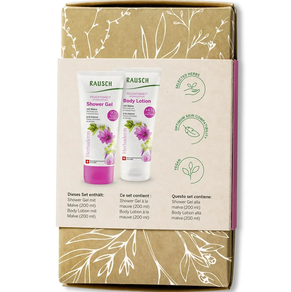Das Rausch Geschenkset Feuchtigkeit ist ein Pflege-Set für normale und trockene Haut. Der sanfte Blumenduft hinterlässt ein wohliges Gefühl, das Dich den ganzen Tag begleiten wird. Die beiden veganen Hautschmeichler verwöhnen und pflegen dank einem neuartigen feuchtigkeitsspendenden Wirkstoff. Dieser bewahrt die Feuchtigkeit der Haut und schützt sie vor dem Austrocknen. Deine Haut fühlt sich hydriert, zart und geschmeidig an. Ideal für samtweiche und glatte Haut von Kopf bis Fuss – zum Verlieben schön. Die verwöhnenden Eigenschaften spiegeln sich auch in den natürlichen Inhaltsstoffen der Linie wider: Mindestens 90 % der Rezepturen Made in Switzerland bestehen aus Inhaltsstoffen natürlichen Ursprungs, darunter Extrakte aus Malve, Weizenkleie und Traubenkernen.