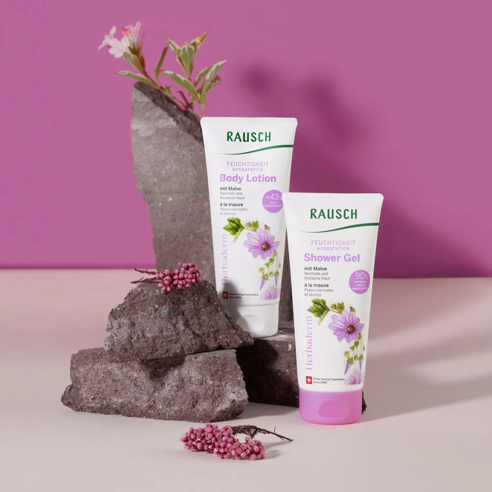 Die Rausch Body Lotion mit Malve mit der Extraportion Feuchtigkeit. Sie nährt normale und trockene Haut und spen-det mit ihrem 4-fach Feuchtigkeits-Booster intensive und langanhaltende Feuchtigkeit ab der ersten Anwendung. Sie zieht schnell ein, glättet sanft trockene Hautstellen und hinterlässt ein wohliges Hautgefühl. Mit Traubenkernöl sowie auserwählten Extrakten aus Malve und Weizenkleie.
