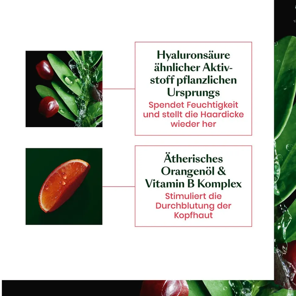 Die Haare und Kopfhaut werden wie die Haut mit der Zeit dünner und schwächer. Dank der außergewöhnlichen Kombination aus Tamarindensamen-Extrakt, ein pflanzlicher Hyaluronsäureähnlicher Aktivstoff und Weizenmikroproteine, außergewöhnlich reich an Proteinen, und ätherischem Orangen-Öl und Vitaminen (B3, B5, B6 & B8), wird die Haarfaser aufgepolstert, verdichtet und bis in die Tiefe geschützt.