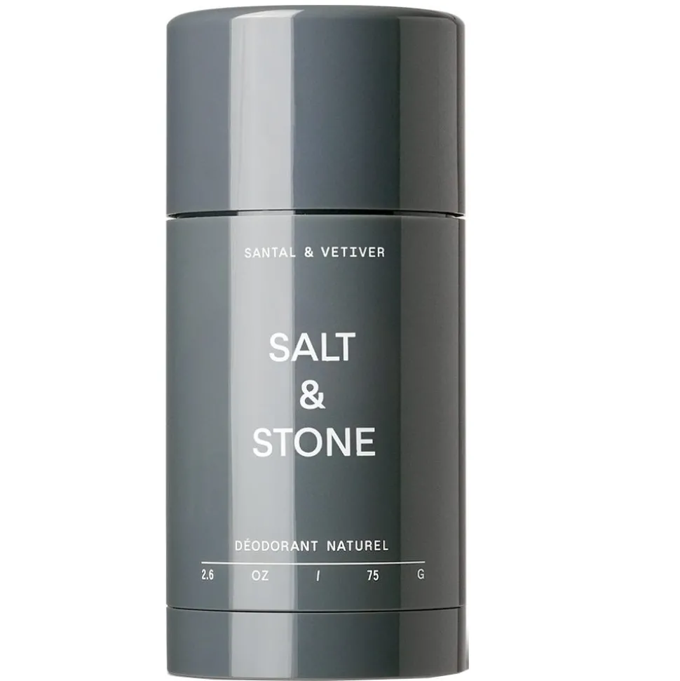 Das Salt & Stone Deo Santal & Vetiver ist ein natürliches Deo für alle Hauttypen. Die klare Formel lässt sich komplett rückstandsfrei auftragen und hinterlässt keine Flecken. Hyaluronsäure pflegt die Haut und spendet ihr Feuchtigkeit, während Probiotika den Geruch neutralisieren. Das Deo ist ohne Aluminium, Alkohol, Natron, Parabene, synthetische Duft- und Farbstoffe hergestellt.