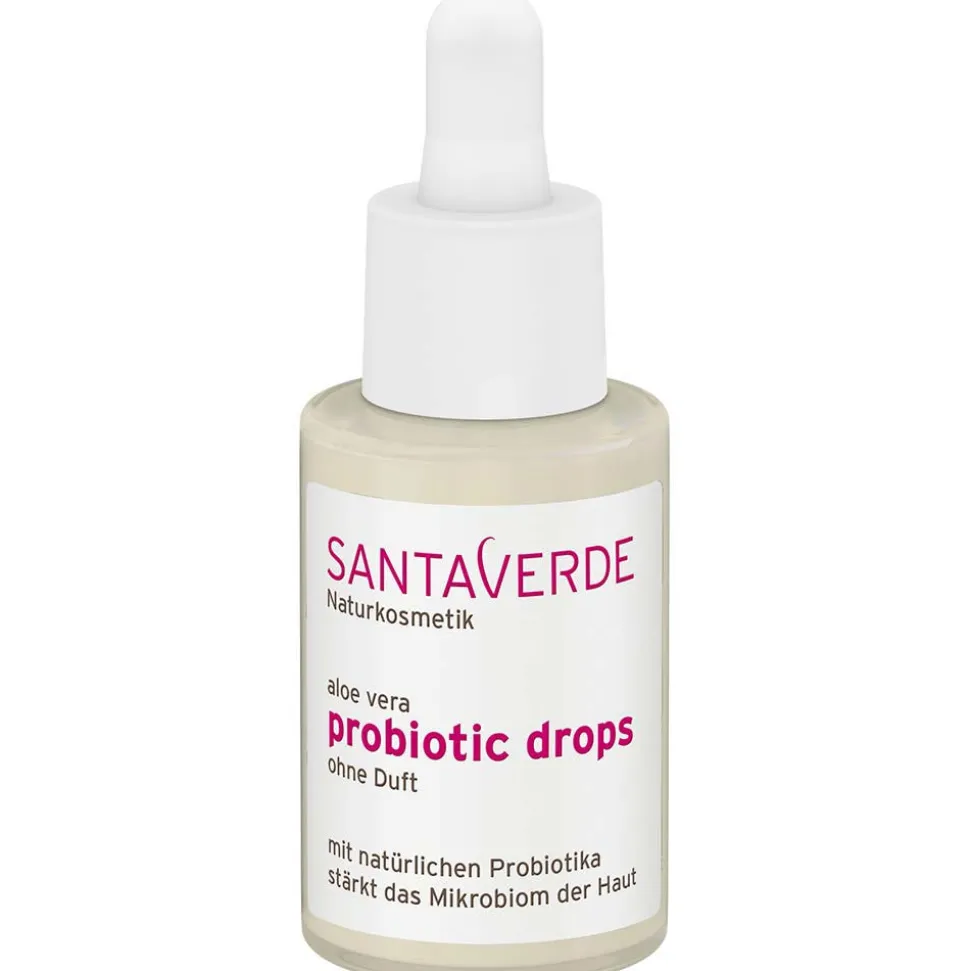 Die Santaverde Probiotic Drops unterstützen die natürlichen Abwehrkräfte der Haut und regulieren die Hautbalance. Reiner Aloe Vera Saft und Lindenblütenhydrolat wirken reizlindernd. Hyaluron bindet Feuchtigkeit in der Haut und stabilisiert die Barrierefunktion. Natürliche Probiotika aus fermentierten Milchsäurebakterien stärken das Mikrobiom der Haut und wirken reparierend. Verleiht eine gestärkte, geschützte und ausgeglichene Haut. Besonders geeignet für sensible und irritierte Haut.