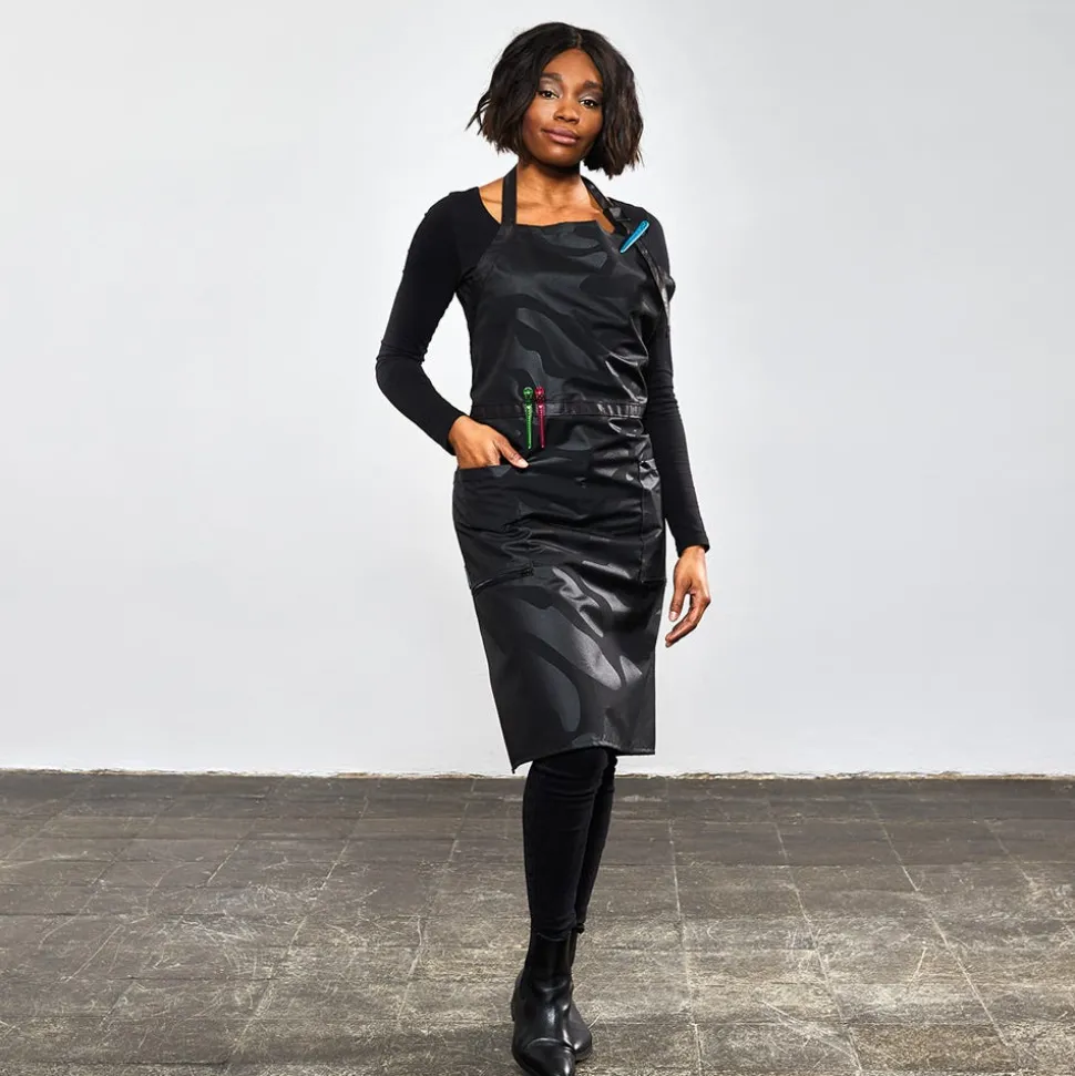 Die Färbeschürze in gewohnter Nano-Qualität ist fleckabweisend und wasserdicht. Echt praktisch: mit der „Hair off“ Reißverschlusstasche (unterhalb) lassen sich Haare ganz einfach entfernen. In den Werkzeugschlaufen lassen sich zahlreiche Hair-Tools verstauen