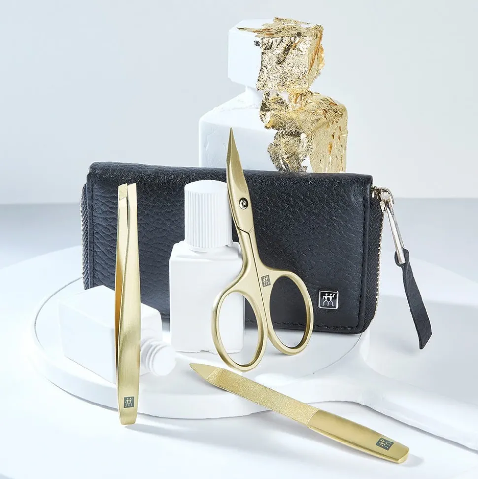 Das Zwilling Premium Maniküre Set 3-teilig in Schwarz ist ideal für die tägliche Nagelpflege und besonders praktisch für die sichere Aufbewahrung von Beauty Tools zuhause oder auch unterwegs. Das moderne, schwarze Rindleder-Etui mit Reißverschluss und innenseitigem Samtbezug beinhaltet eine Nagel- und Hautschere, eine Saphir-Nagelfeile und eine schräge Pinzette. Die Fertigung aus hochwertigem, rostfreiem Edelstahl und die aufwendige Veredlung mit einer innovativen, goldenen PVD-Beschichtung garantieren hygienisches Reinigen, maximale Kratzbeständigkeit sowie eine lange Nutzungsdauer.