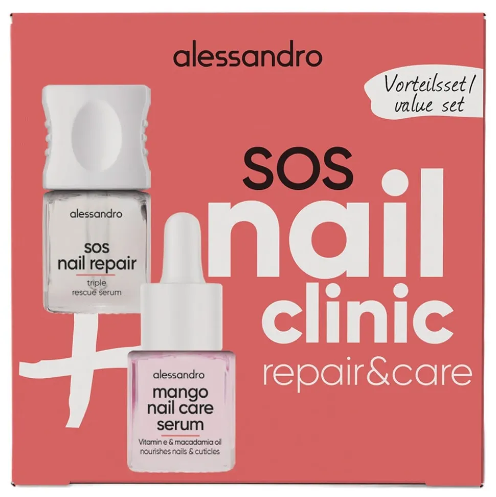 alessandro Nail Clinic Box Repair & Care Set – Ein kraftvolles Set für gesunde, starke und gepflegte Nägel. Das Set enthält 1x alessandro SOS Nail Repair Serum 10 ml und 1x alessandro Mango Nail Care Serum 10 ml.