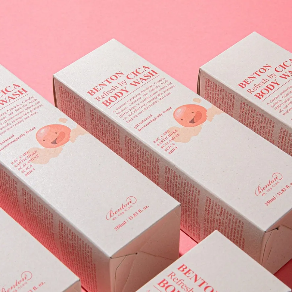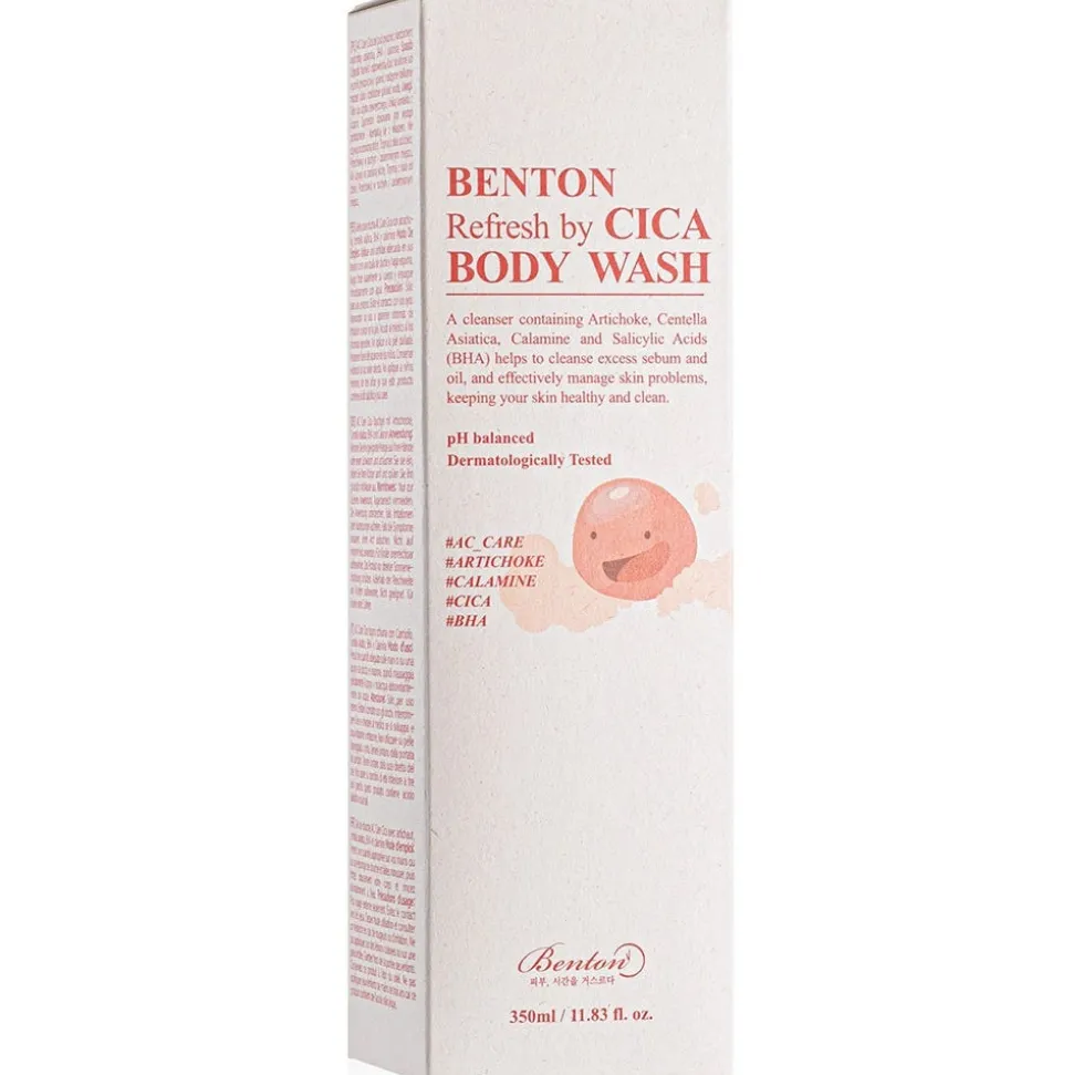 Nicht komedogenes Benton Refresh by Cica Body Wash, das die Haut nicht nur reinigt, sondern auch mit Feuchtigkeit versorgt und schützt. Dank seinem leicht sauren pH-Wert kann dieses Reinigungsgel bei Bedarf auch fürs Gesicht verwendet werden. Enthält Artischockenblattextrakt, Centella asiatica und BHA, die die Haut dank ihren feuchtigkeitsspendenden, peelenden und beruhigenden Eigenschaften reinigen und gleichzeitig pflegen und schützen. Das Benton Refresh by Cica Body Wash der koreanischen Marke Benton hat einen erfrischenden Duft und eine angenehme Textur. Es hinterlässt kein Spannungsgefühl auf der Haut und ist daher ideal für Menschen mit zu Akne neigender oder fettiger Haut, da es die Haut sanft peelt und Pickel am Körper behandelt.