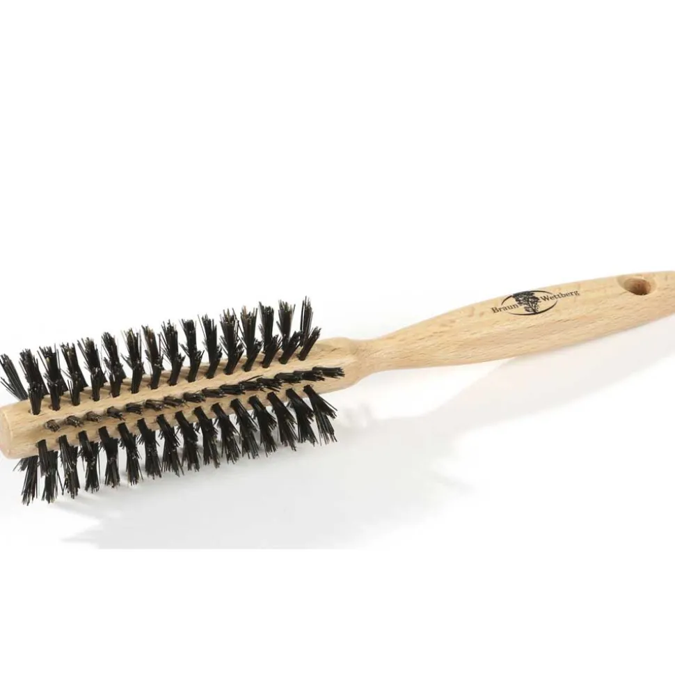 Die Buchenholzbürste Braun & Wettberg 100% Wildschweinborsten-Rundbürste ist farblos gewachst und mit 100% Wildschweinborsten ausgestattet. Sie ist extra kräftig.
