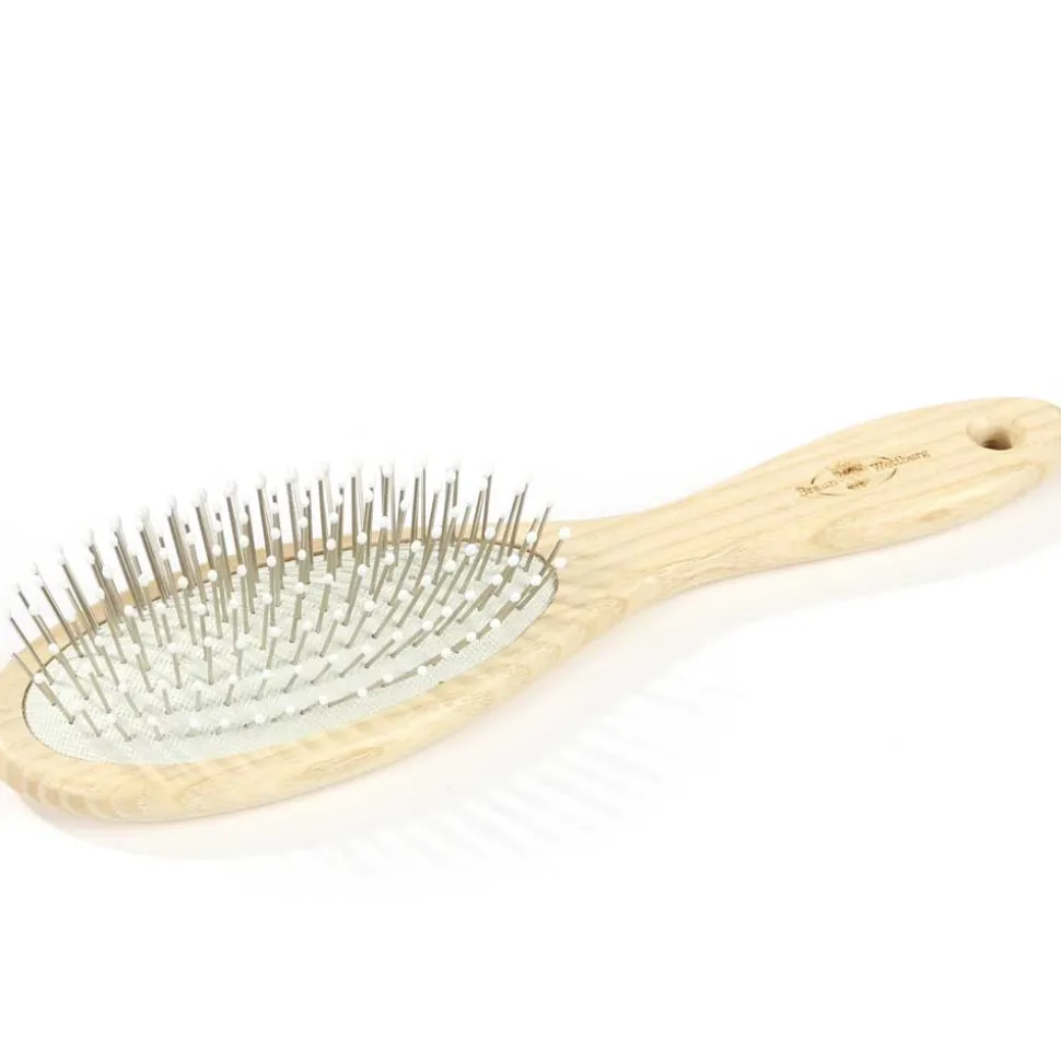 Die Braun & Wettberg Eschenholzbürste groß, Drahtstifte ist aus Eschenholz gefertigt und verfügt über weiße Drahtstifte mit Noppen.